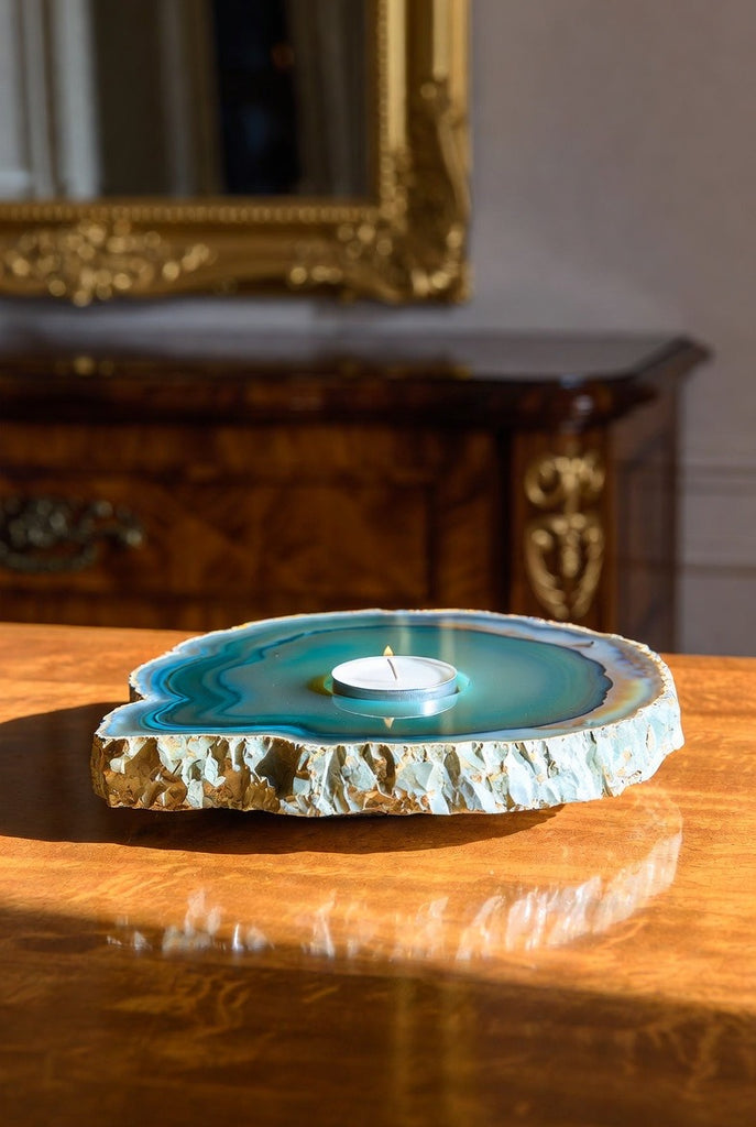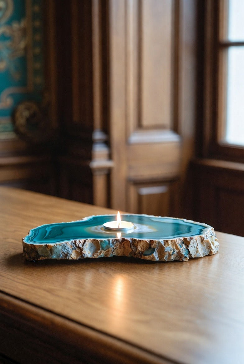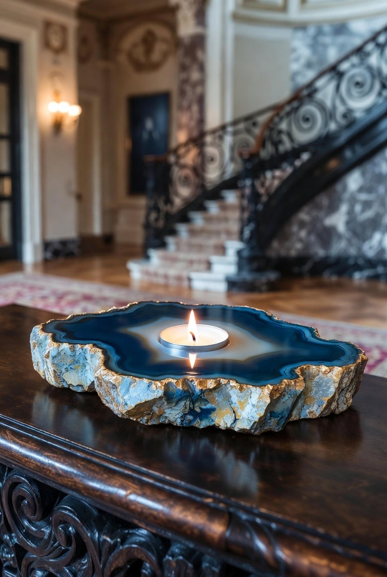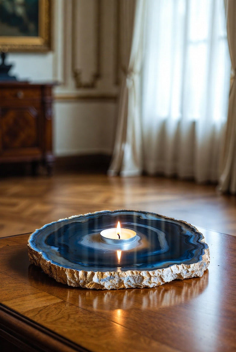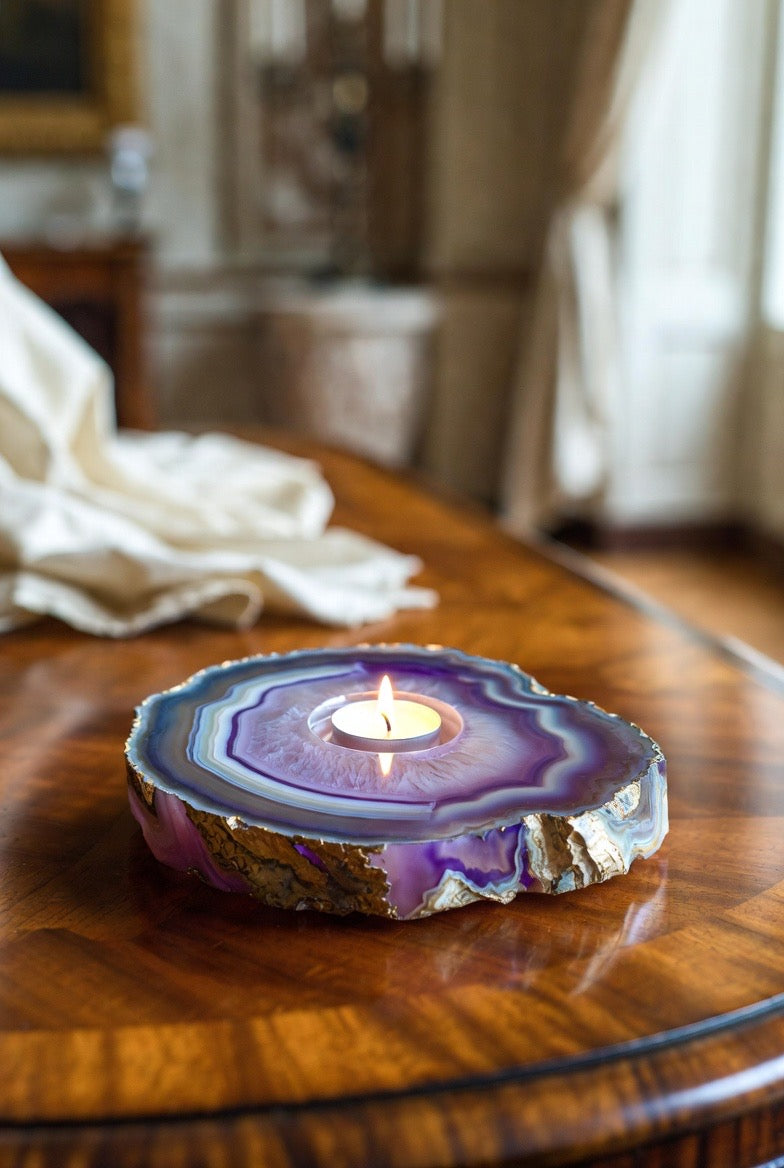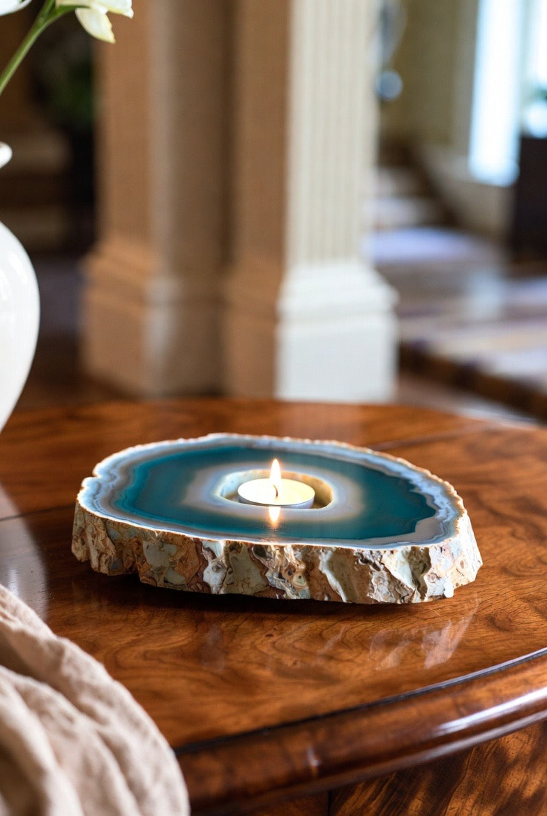 Each natural agate slice is polished to perfection, bringing luxury, color, and glowing elegance to your home. And yes — each holder includes a FREE tealight candle! 🕯️🎁