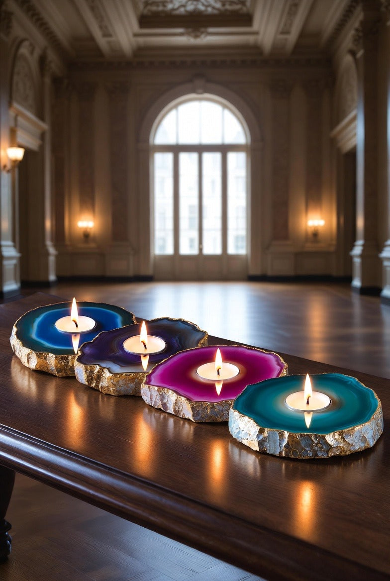 Introducing our Jewel-Tone Agate Slab Candleholder Set (4-Piece) — a radiant way to elevate any space! 💎🕯️