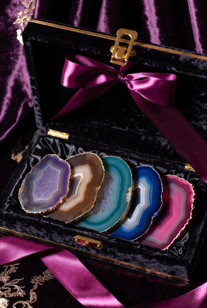 This listing is for 1 (one) Jewel-Toned Agate Slice Coaster Set of 5 (five) Agate Slices: Violet Purple, Teal Blue, Fuchsia Pink, Royal Blue and Chocolate Brown. Each Agate Coaster Slice is unique and one-of-a-kind. Yours will arrive lovingly parceled and ready for enjoyment!