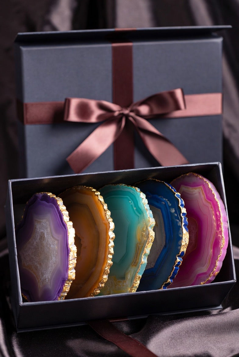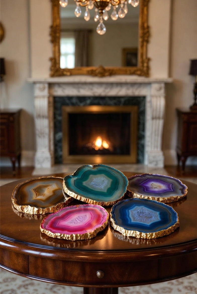 Elevate your home with this set of 5 elegant agate slice coasters, each a vibrant jewel in Royal Blue, Fuchsia Pink, Violet Purple, Teal Blue, and Rich Chocolate Brown. These stunning coasters are more than just functional—they’re mini works of art, adding a sophisticated pop of color to any tabletop.