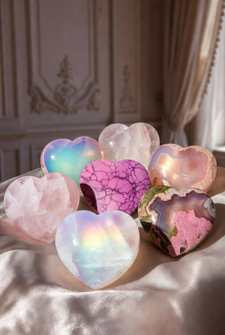 Step into a world of soft whispers and cotton-candy skies π Blush & Rose is a dreamy collection of polished gemstone hearts that celebrates love, compassion, and tender moments. Each heart carries its own magic, radiating warmth, calm, and a touch of ethereal sparkle.