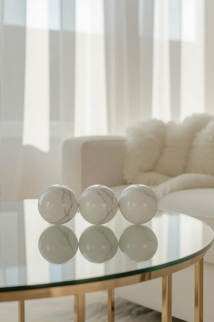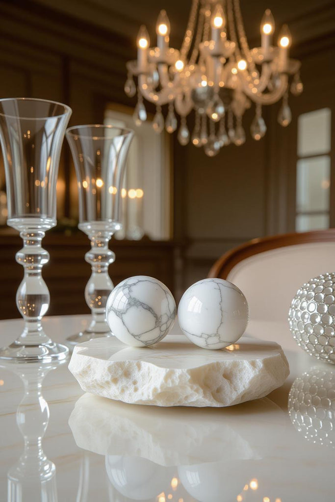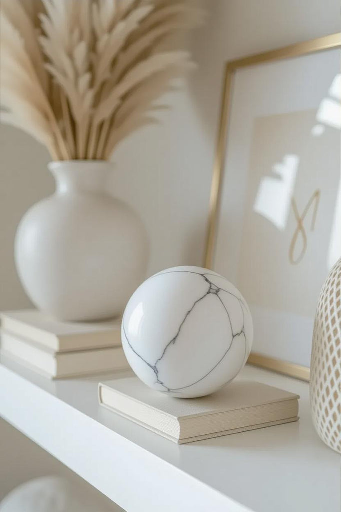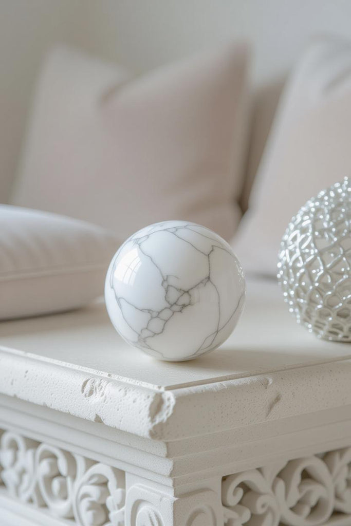 Create a calm, minimalist sanctuary with this polished White Howlite sphere, a timeless piece that brings both visual elegance and peaceful energy into your home. With its smooth surface and natural gray veining, each sphere is a unique reflection of nature’s quiet beauty.
