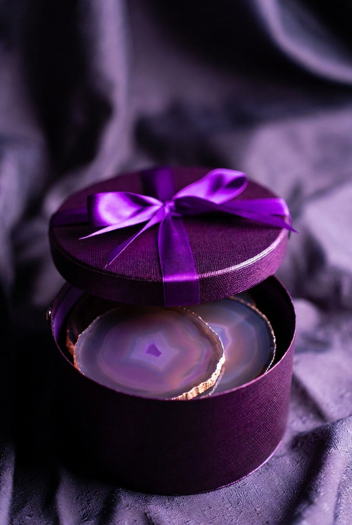 This listing is for 1 (one) PURPLE Agate Slice Coaster Set of 4 (four) coasters. Each Agate Coaster Slice is unique and one-of-a-kind!  Yours will arrive lovingly parceled and ready for enjoyment!