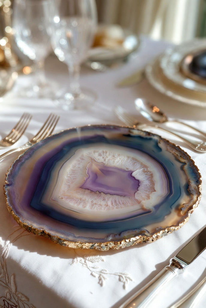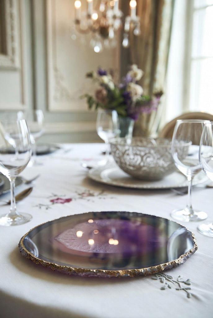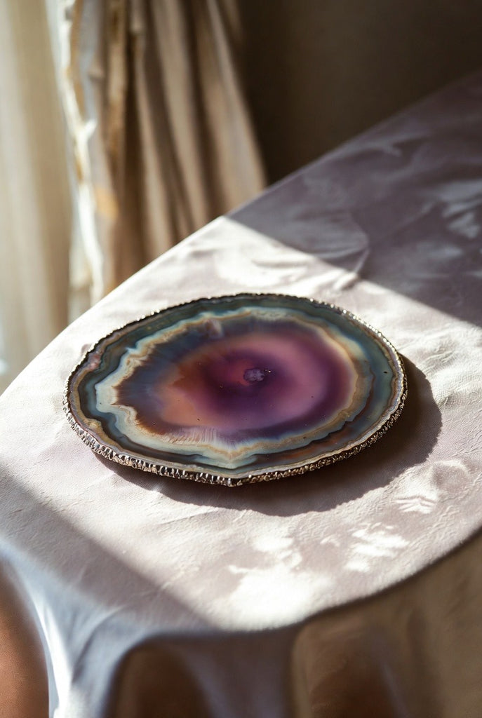 Elevate your table with a breathtaking piece carved from genuine agate. Rich crystal patterns, a glossy polished finish, and shimmering edges make this agate slice both a functional plate and a stunning decorative tray—all in one.