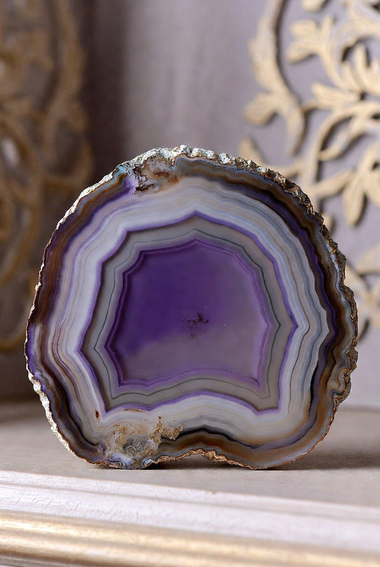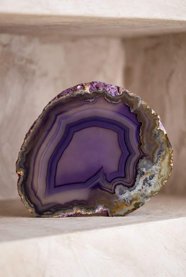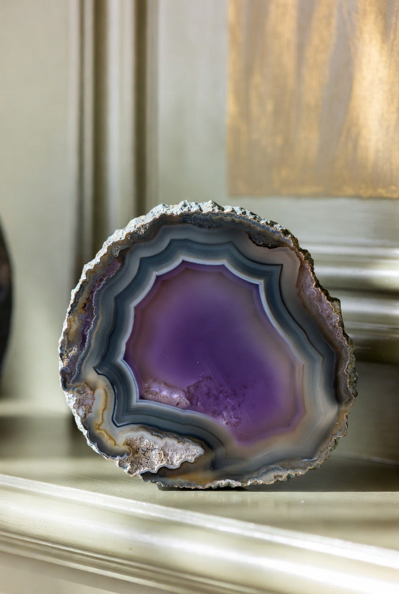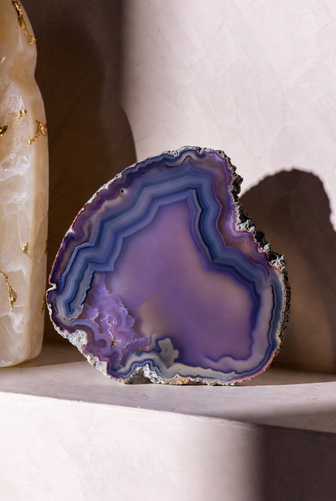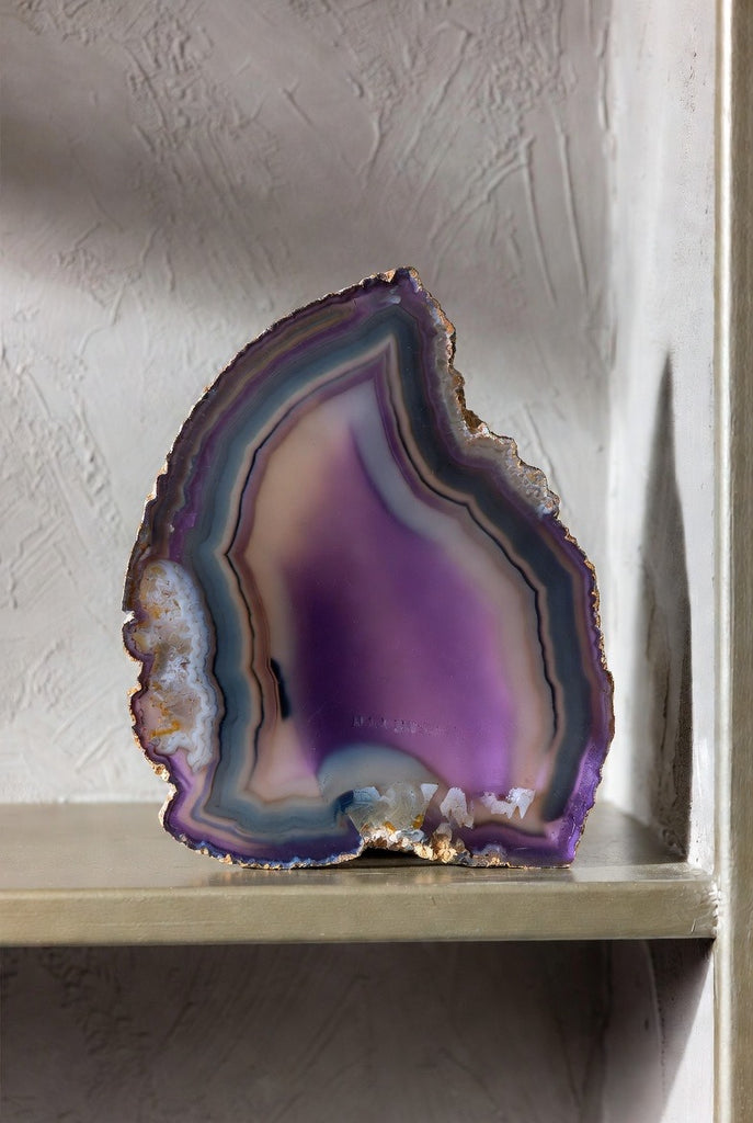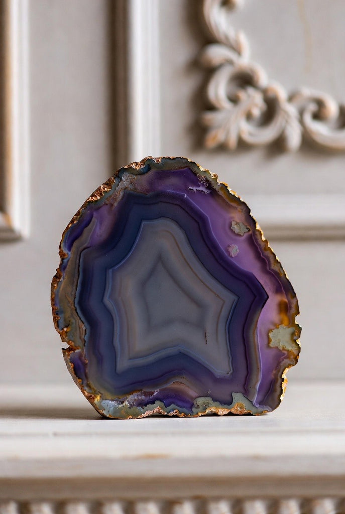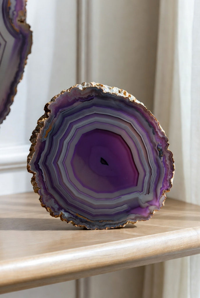 Bring natural elegance and eye-catching color into any room with these polished agate slabs—each one standing beautifully on its own flat base for effortless display.