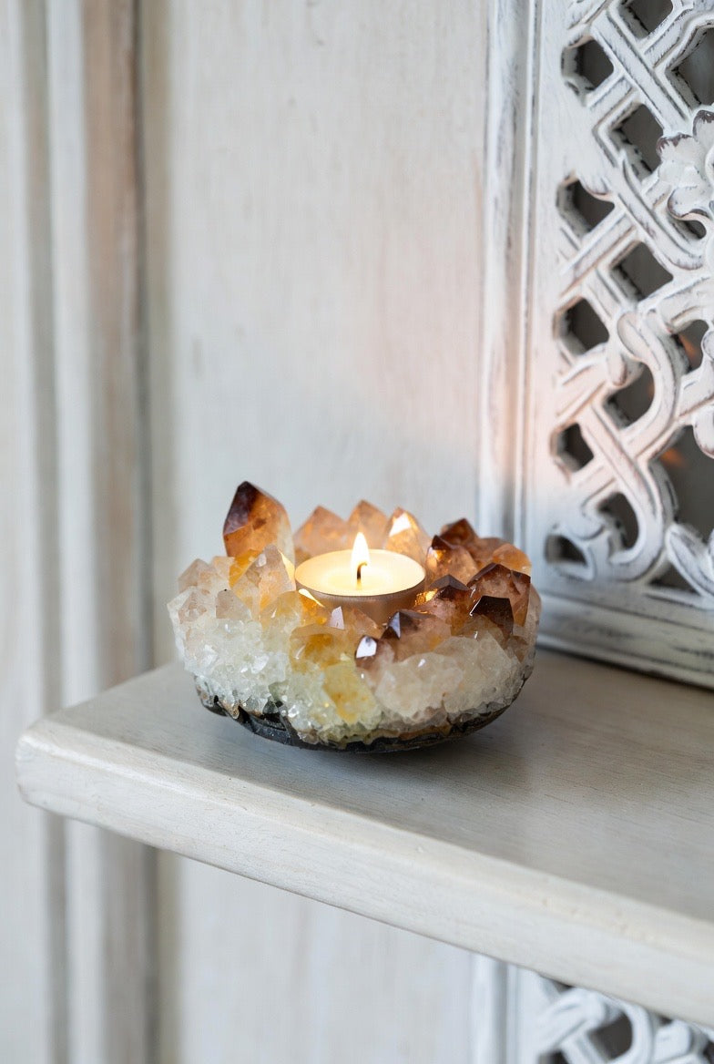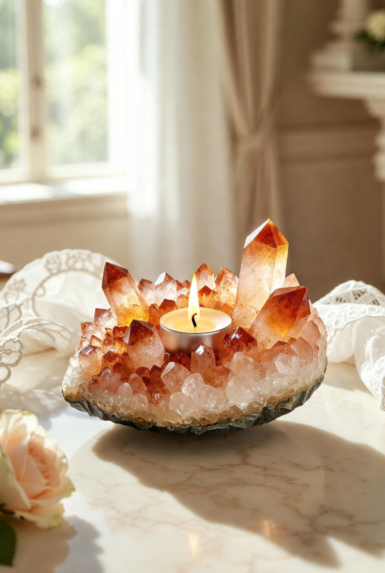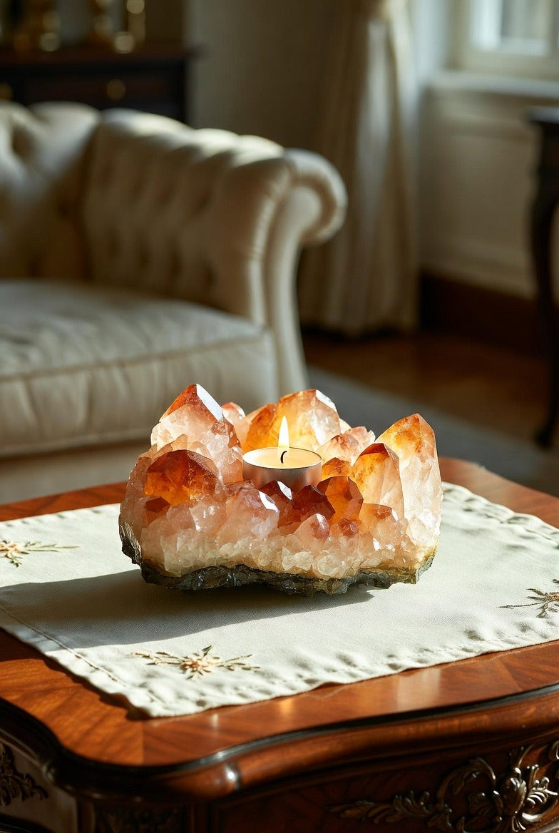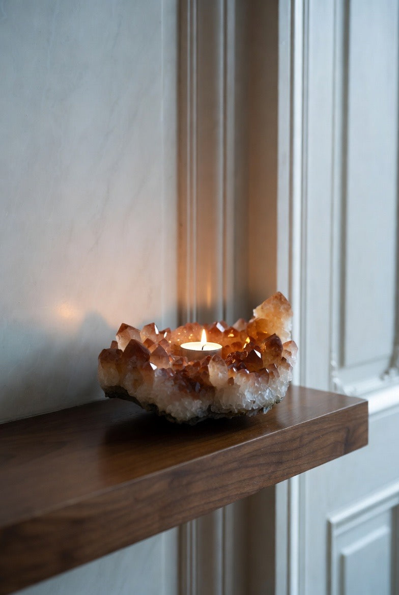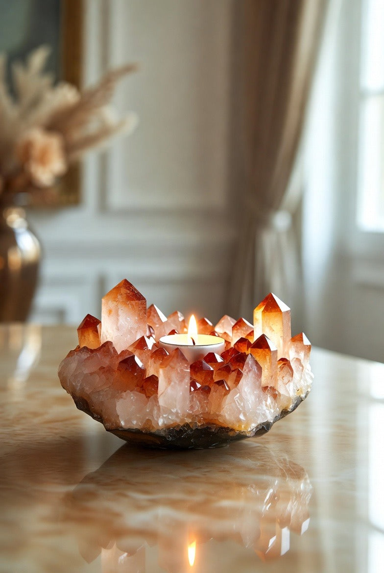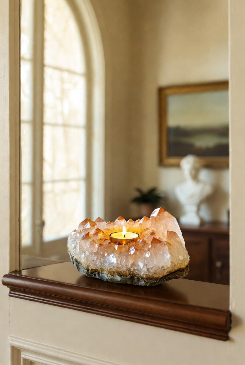 Crafted from a radiant citrine crystal cluster, this elegant candleholder casts a warm, inviting light that instantly elevates any room. Perfect for luxury home decor or thoughtful gift giving, it arrives complete with a free tealight candle so it’s ready to shine from the moment it’s unwrapped ✨🎁