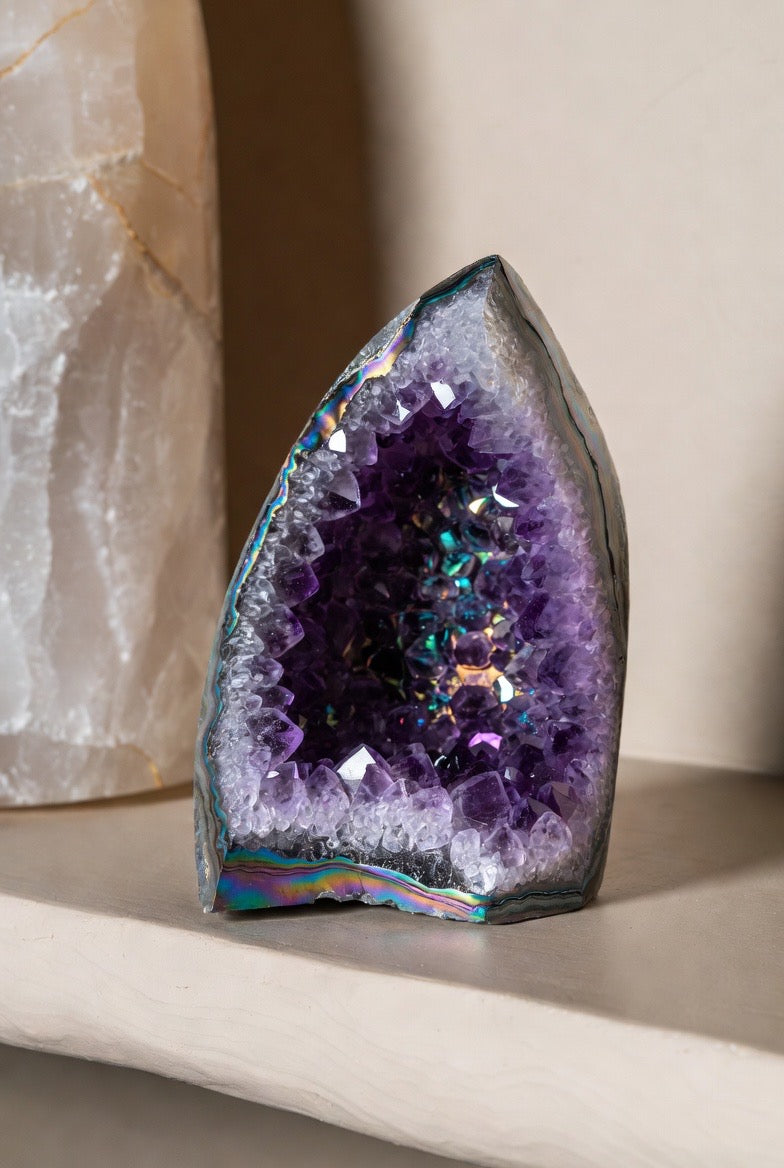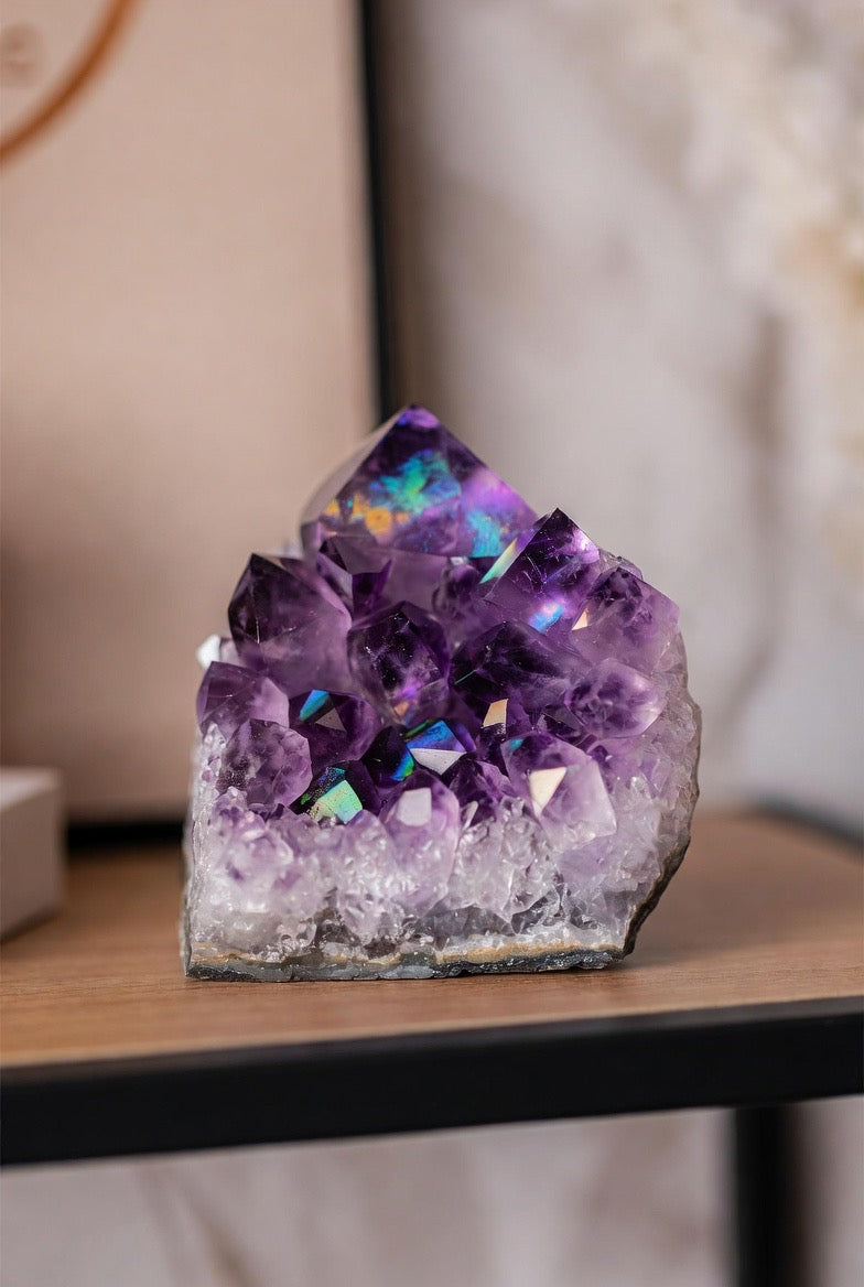 Designed for luxury décor, this cluster blends natural beauty with a modern, refined aesthetic. The rainbow aura finish enhances the deep purple of the amethyst, creating a mesmerizing play of color and light.