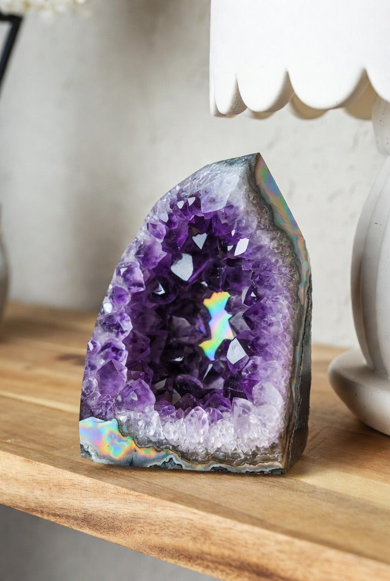 We love this polished rainbow aura amethyst cluster because it’s a perfect blend of natural beauty and luxury. The vibrant rainbow shimmer paired with deep purple tones creates a mesmerizing focal point for any space, while the cut base makes it easy to display elegantly. It’s more than décor—it’s a piece of art that adds color, energy, and sophistication to your home.