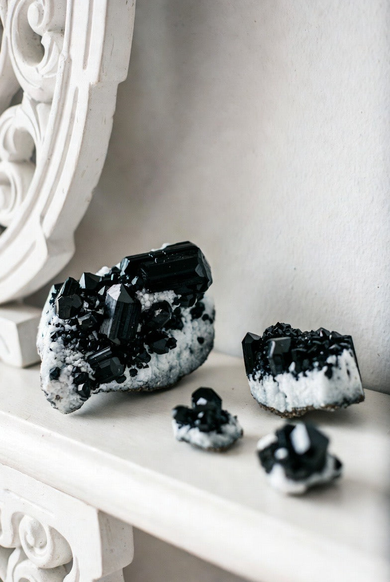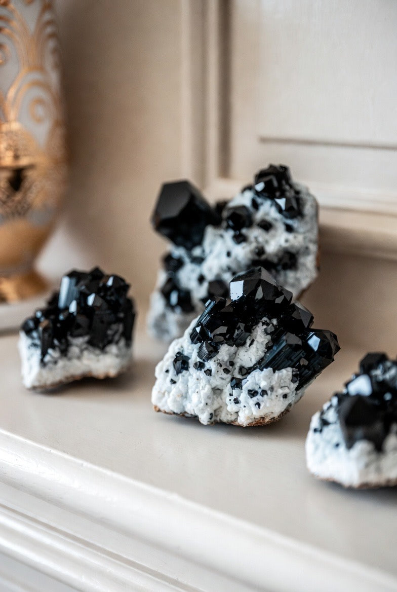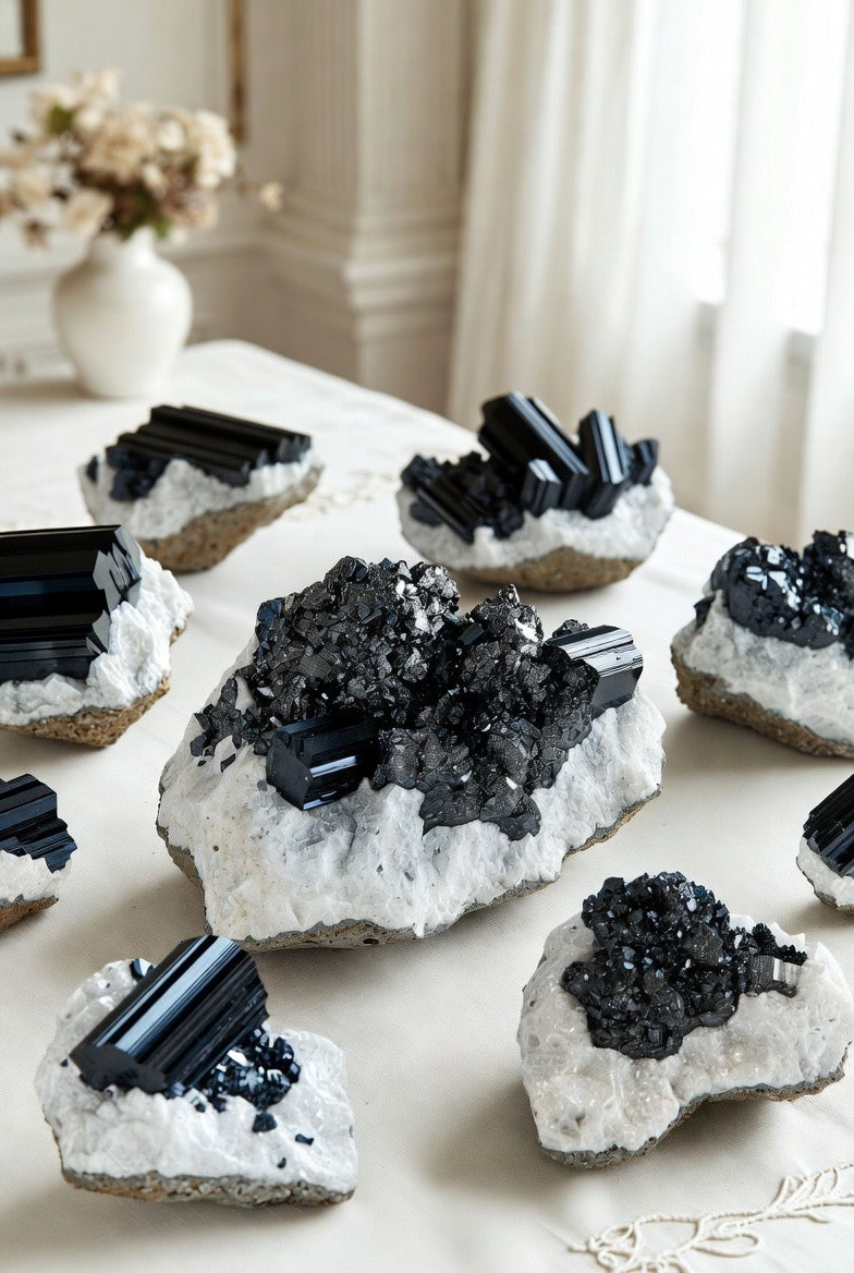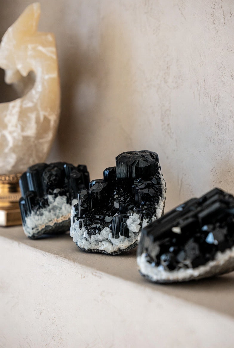 Elevate your space with Black Tourmaline in Matrix, a striking natural dƩcor piece that blends bold contrast with organic texture. Featuring deep black tourmaline crystals set against their natural stone base, this piece adds depth, balance, and sophistication to any interior.