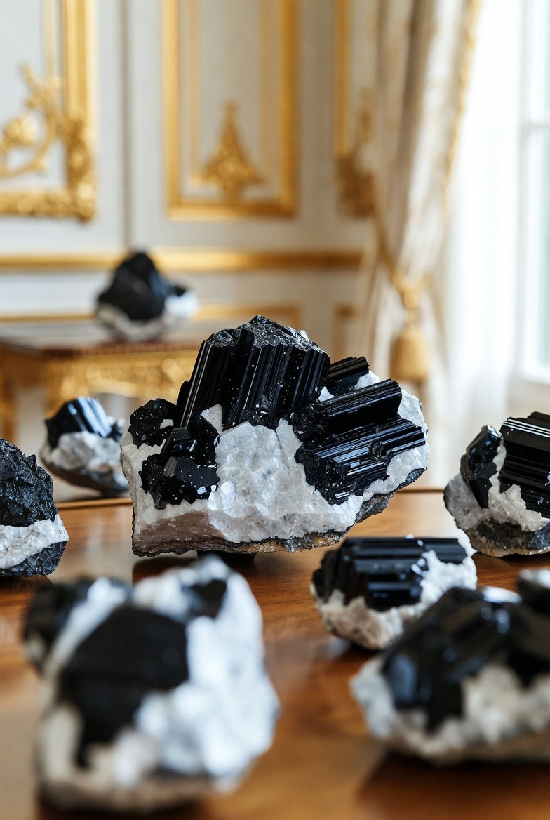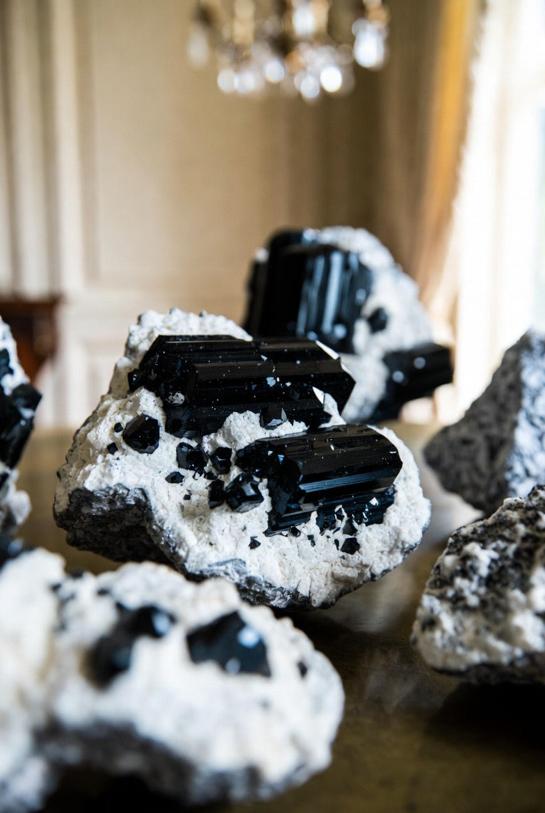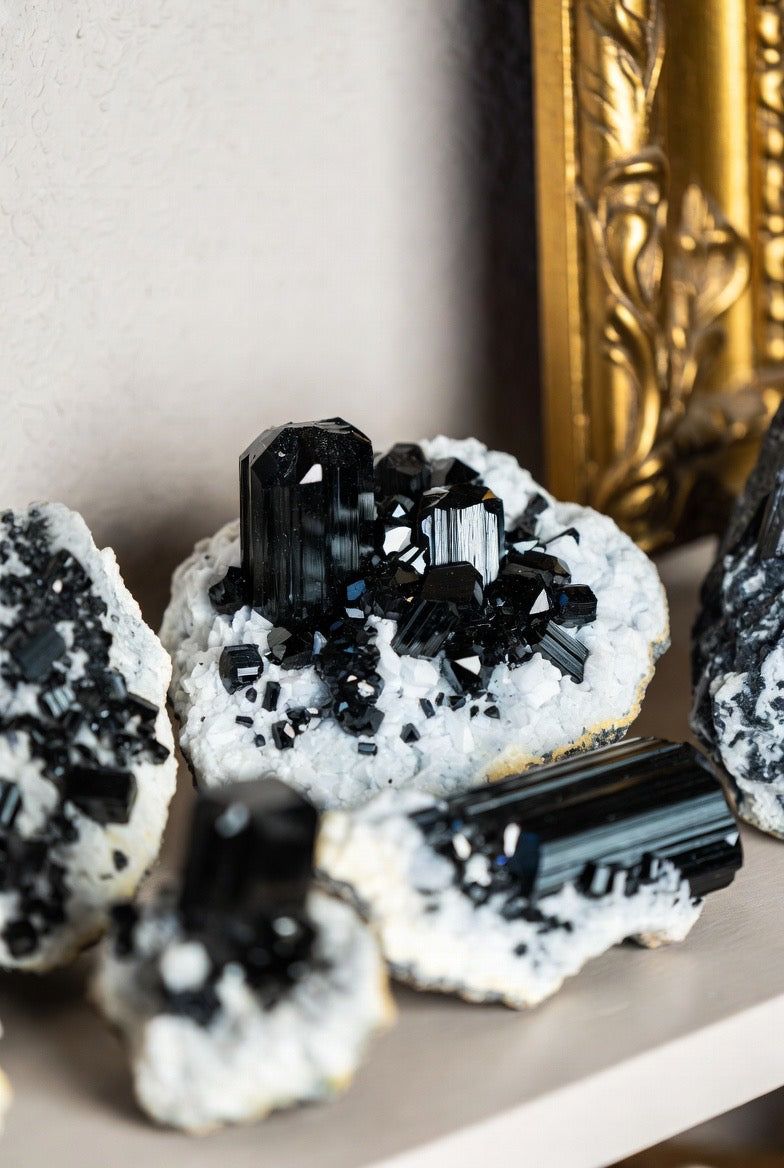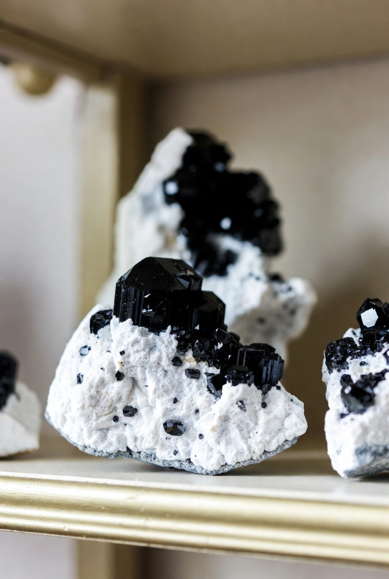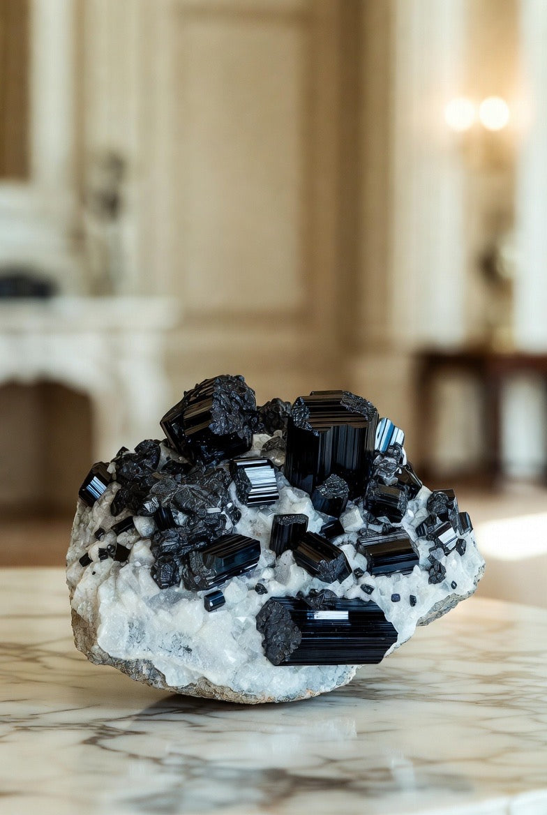 Elevate your space with Black Tourmaline in Matrix, a striking natural dƩcor piece that blends bold contrast with organic texture. Featuring deep black tourmaline crystals set against their natural stone base, this piece adds depth, balance, and sophistication to any interior.