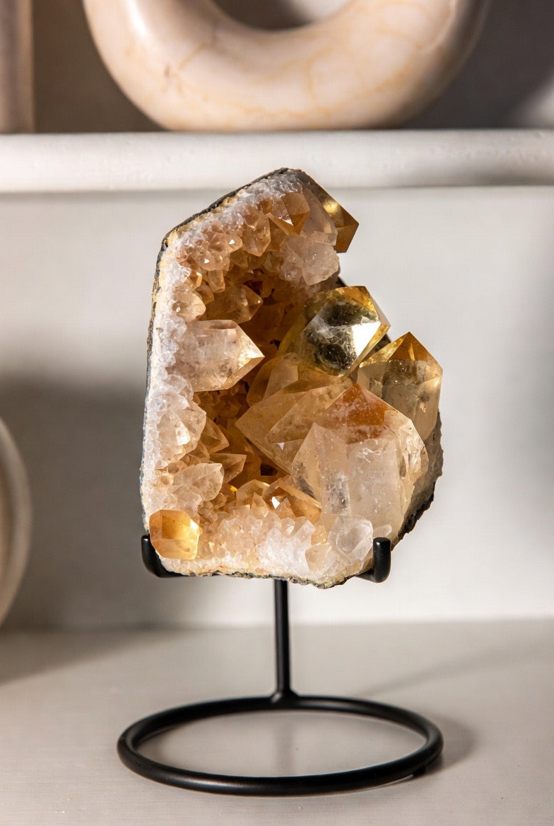 Bring the energy of sunshine and success into your space with our Citrine Cluster on a sleek black metal stand. This striking piece features natural golden crystals bursting with positive energy — elegantly elevated to become a radiant focal point in any room.