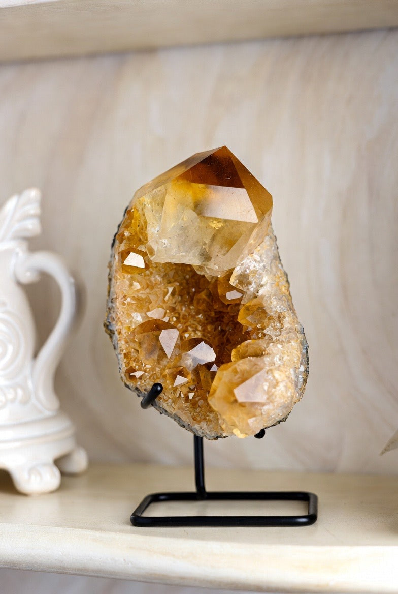This listing is for 1 (one) Citrine Crystal on a Black Metal Stand with sizes ranging in size from 7″ to 17". We offer this in 3 sizes: Small, Medium and Large. Yours will arrive lovingly parceled and ready for enjoyment.
