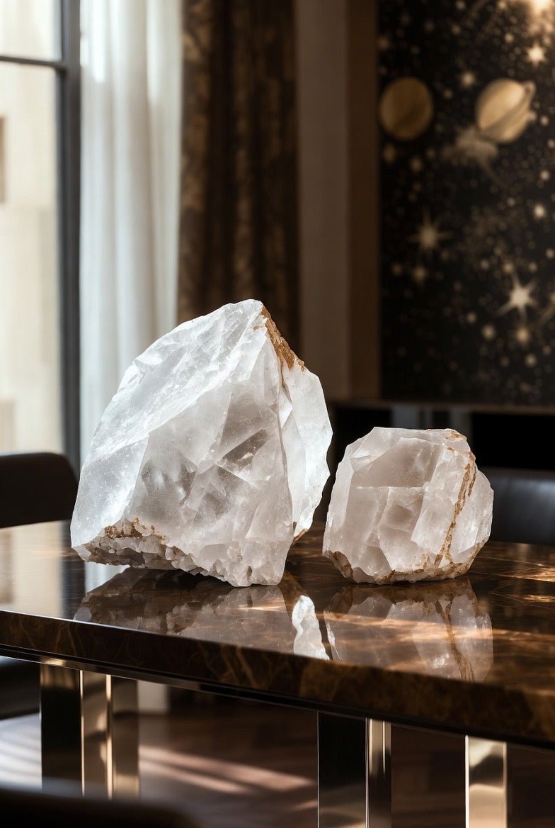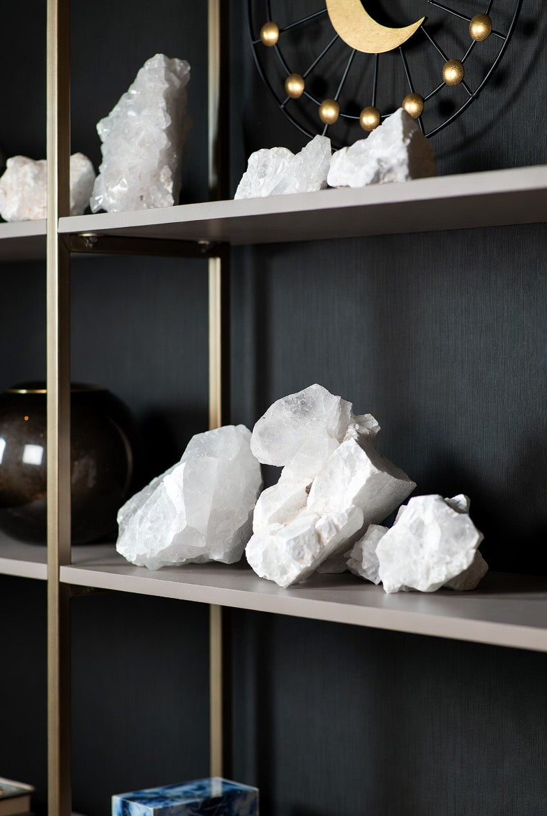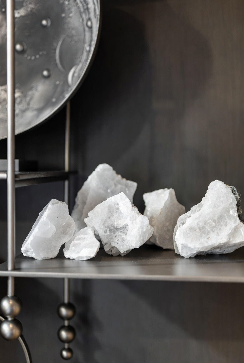 Each piece is hand-selected for its purity, luminosity, and sculptural presence, making it a perfect accent for coffee tables, bookshelves, entryways, or spa-inspired bathrooms. Whether displayed solo or arranged in curated clusters, these quartz chunks reflect light beautifully and add a sophisticated energy to any room.