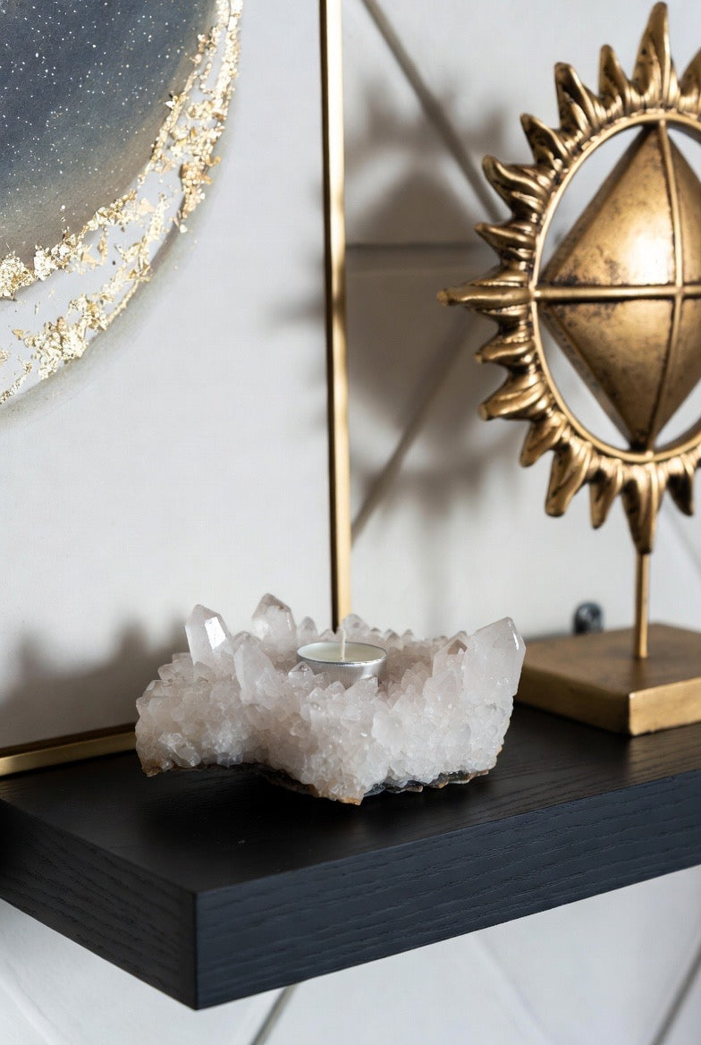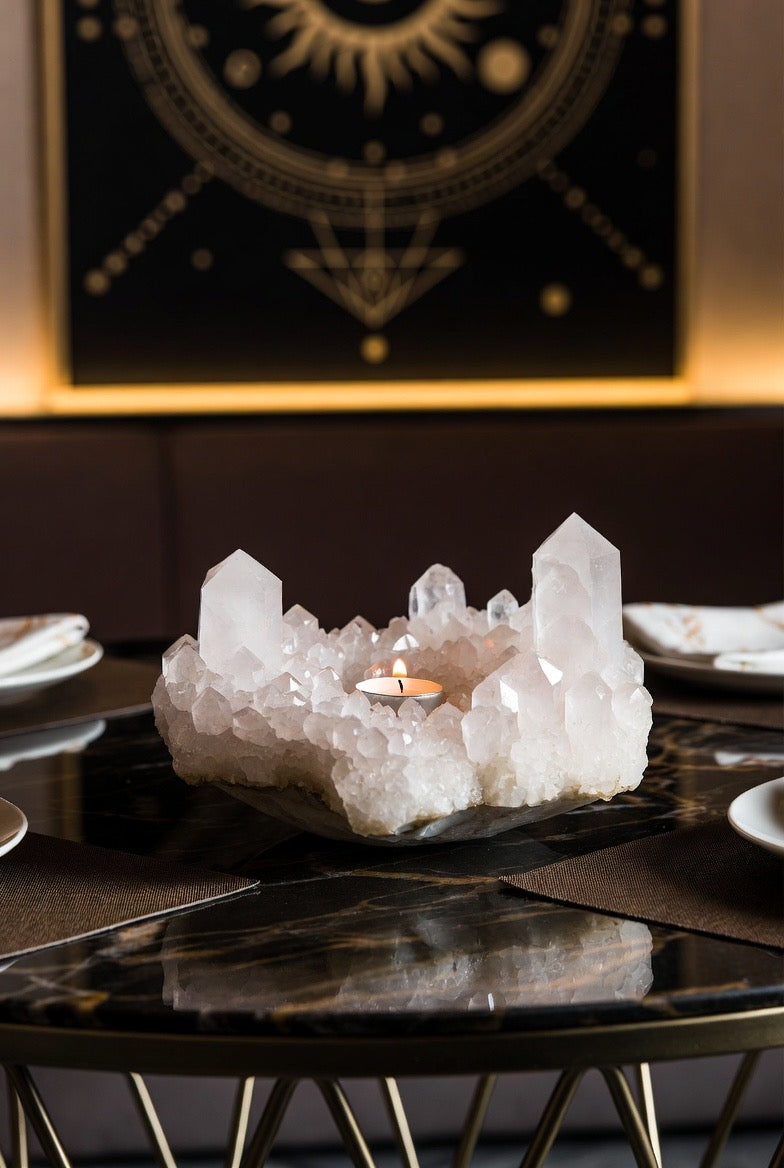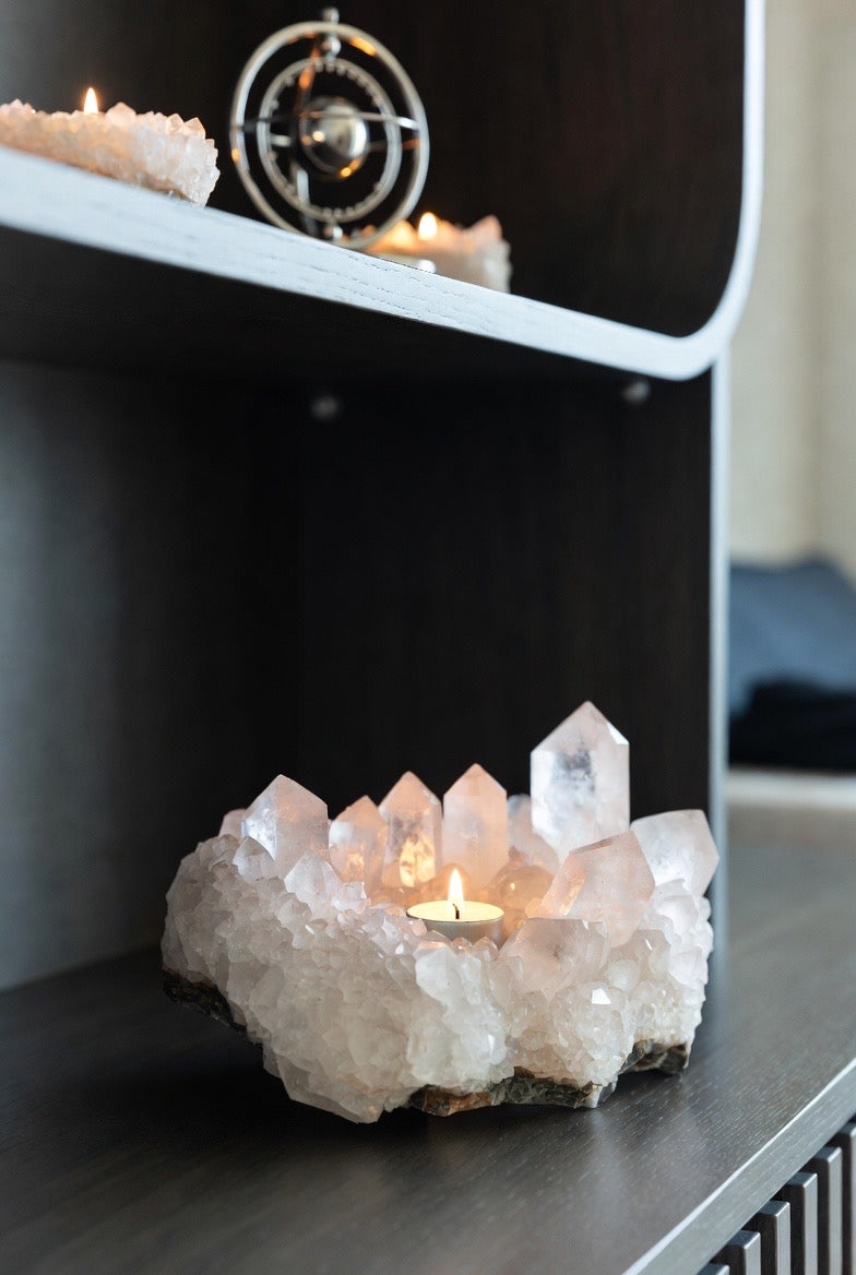 • Crafted from Raw Clear Quartz – Each holder features natural crystal facets that catch and reflect candlelight with ethereal brilliance.