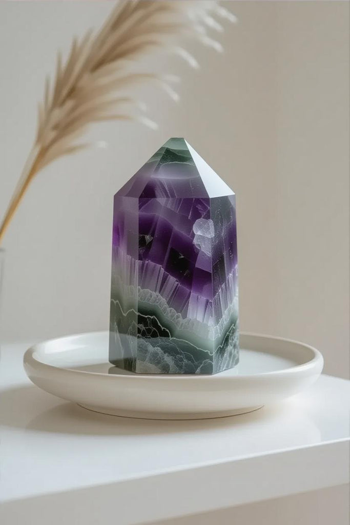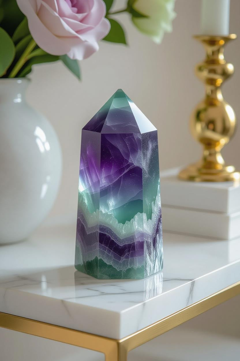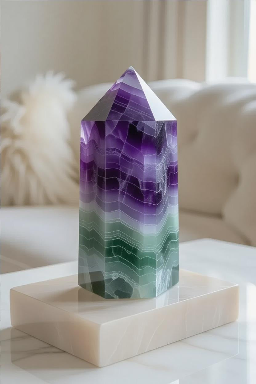 With its vertical form and polished finish, the fluorite point acts as both an energetic amplifier and a refined design element. It stands with quiet strength, adding depth, dimension, and a subtle pop of natural color.