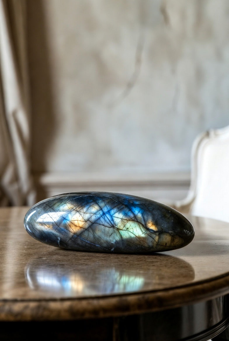 Whether styled atop a stack of art books or placed as a standalone accent, this labradorite palm stone brings a sense of harmony, sophistication, and natural wonder to your home.