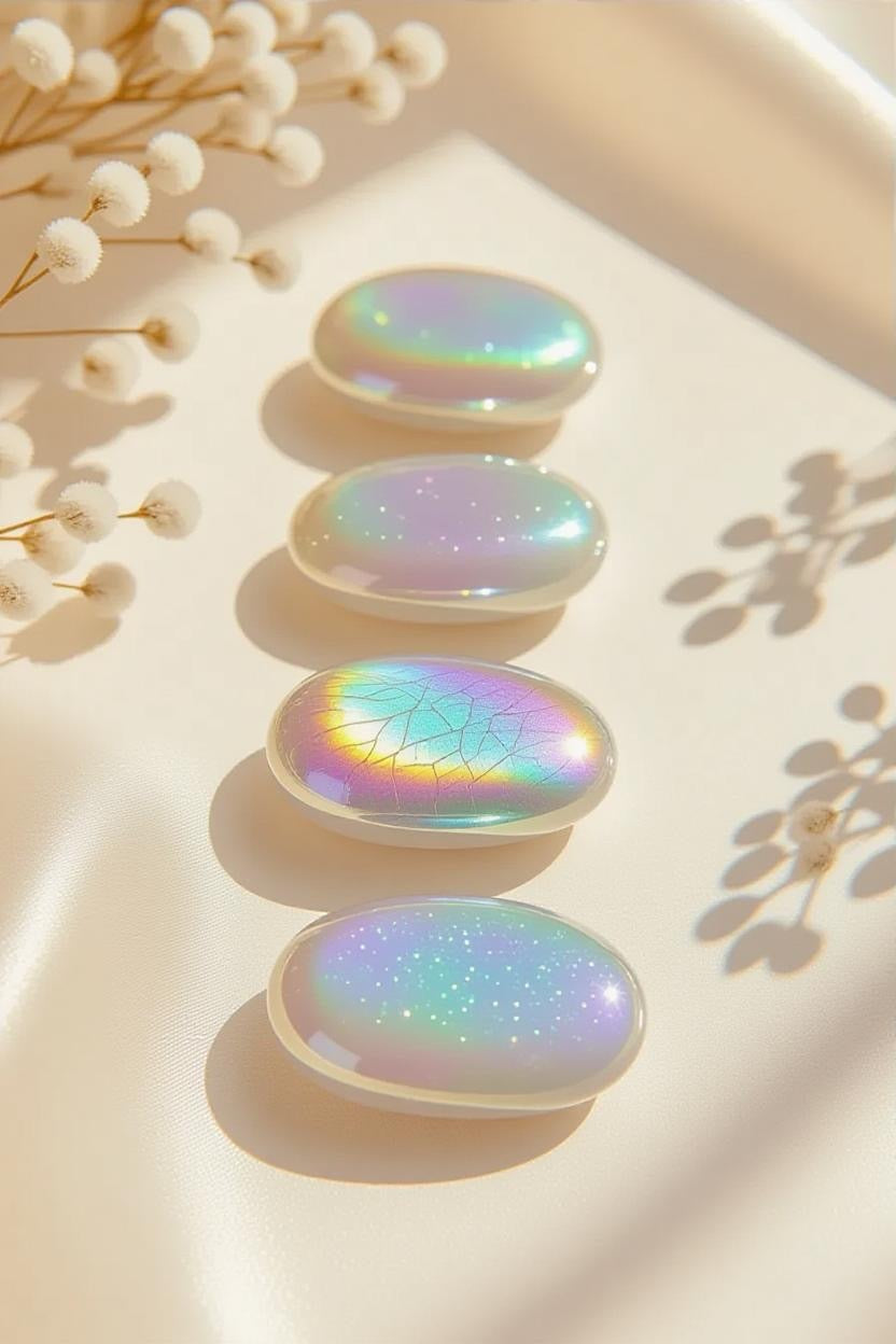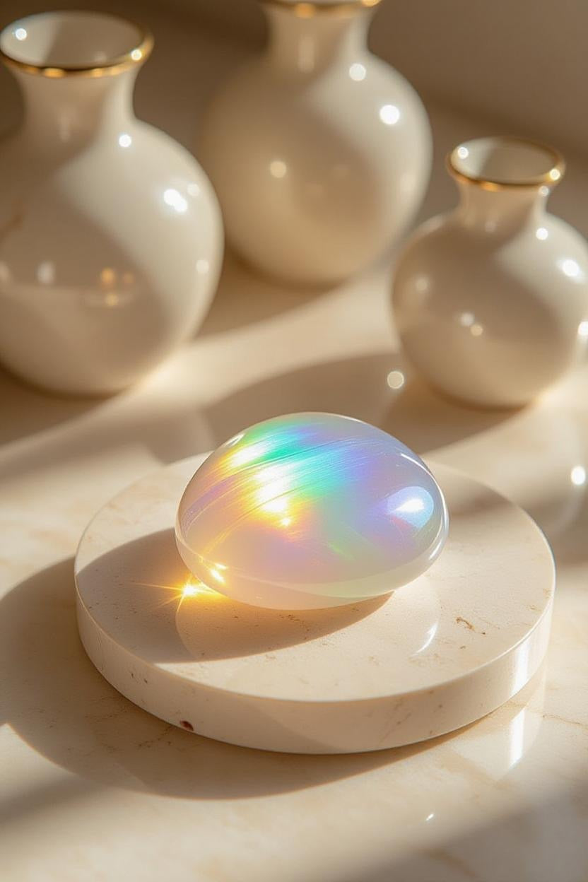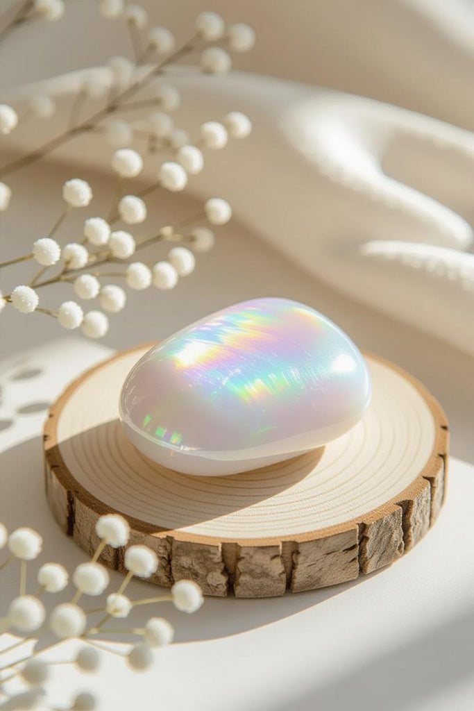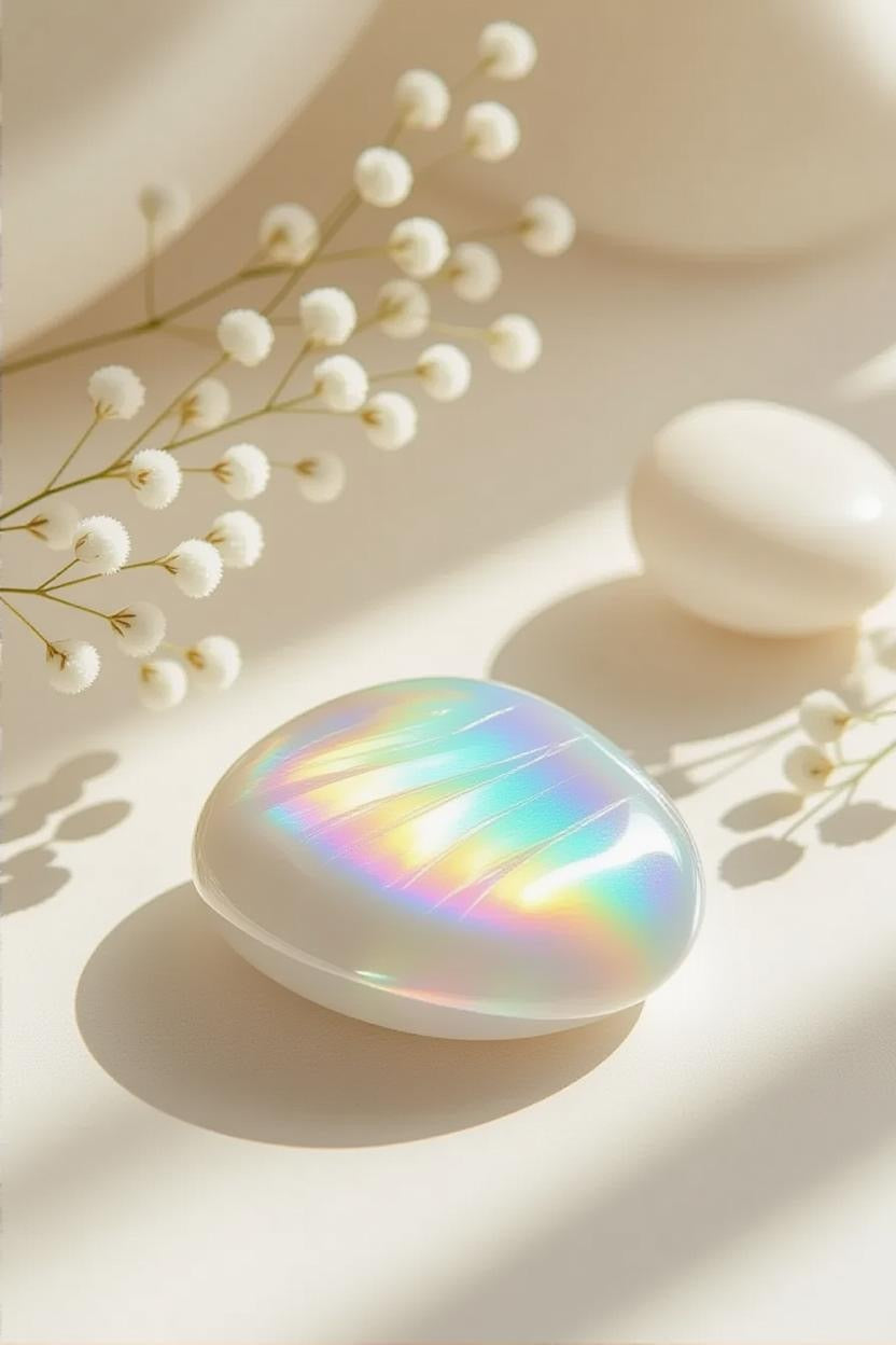 💎 Hand-polished to a smooth, radiant finish, this exceptional piece showcases a delicate iridescent sheen that dances with light, reflecting soft hues of pearl, silver, and pastel rainbow tones.