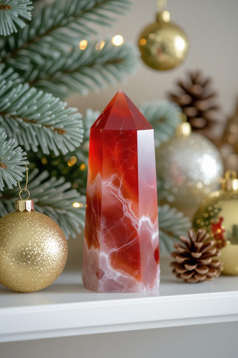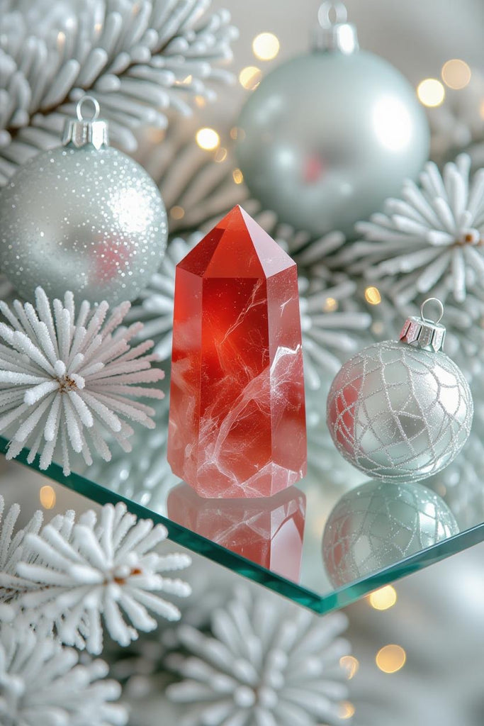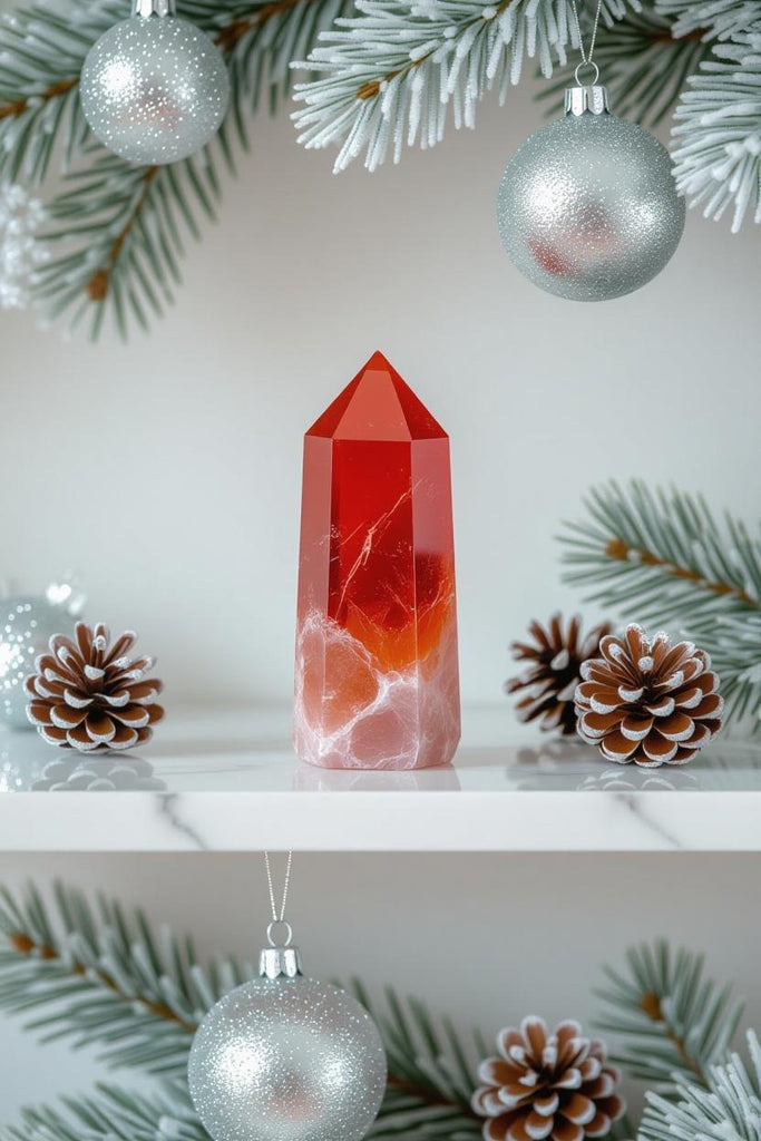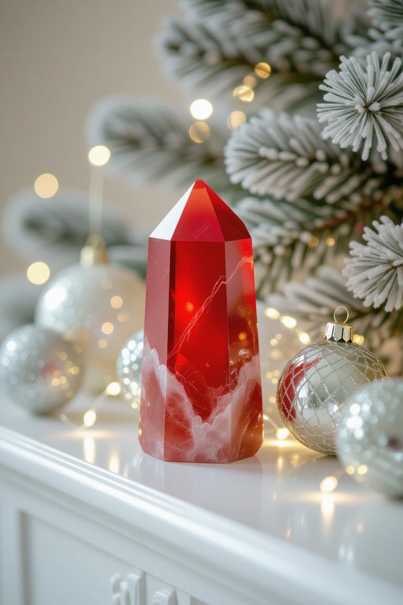 With its deep crimson hue and naturally faceted form, this crystal evokes the richness of the season — reminiscent of holly berries, candlelit gatherings, and the warm glow of winter evenings. Perfectly suited for luxury holiday styling, it pairs beautifully with velvet textures, evergreen garlands, gold accents, and candlelight.
