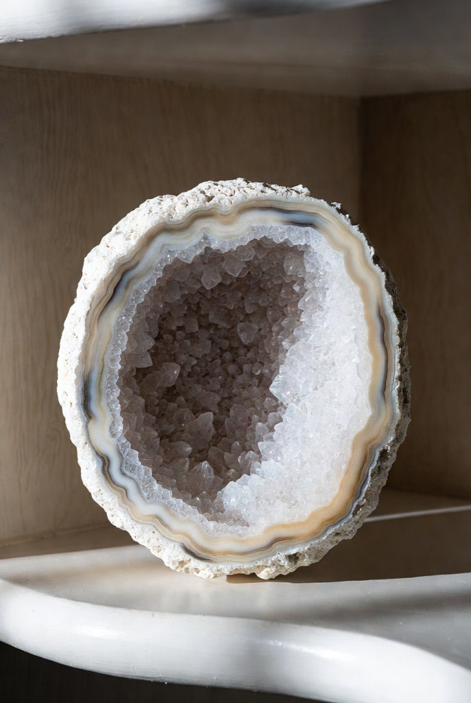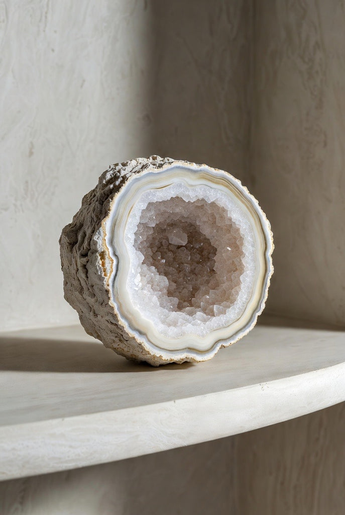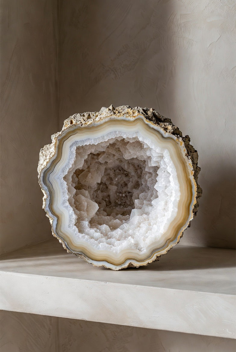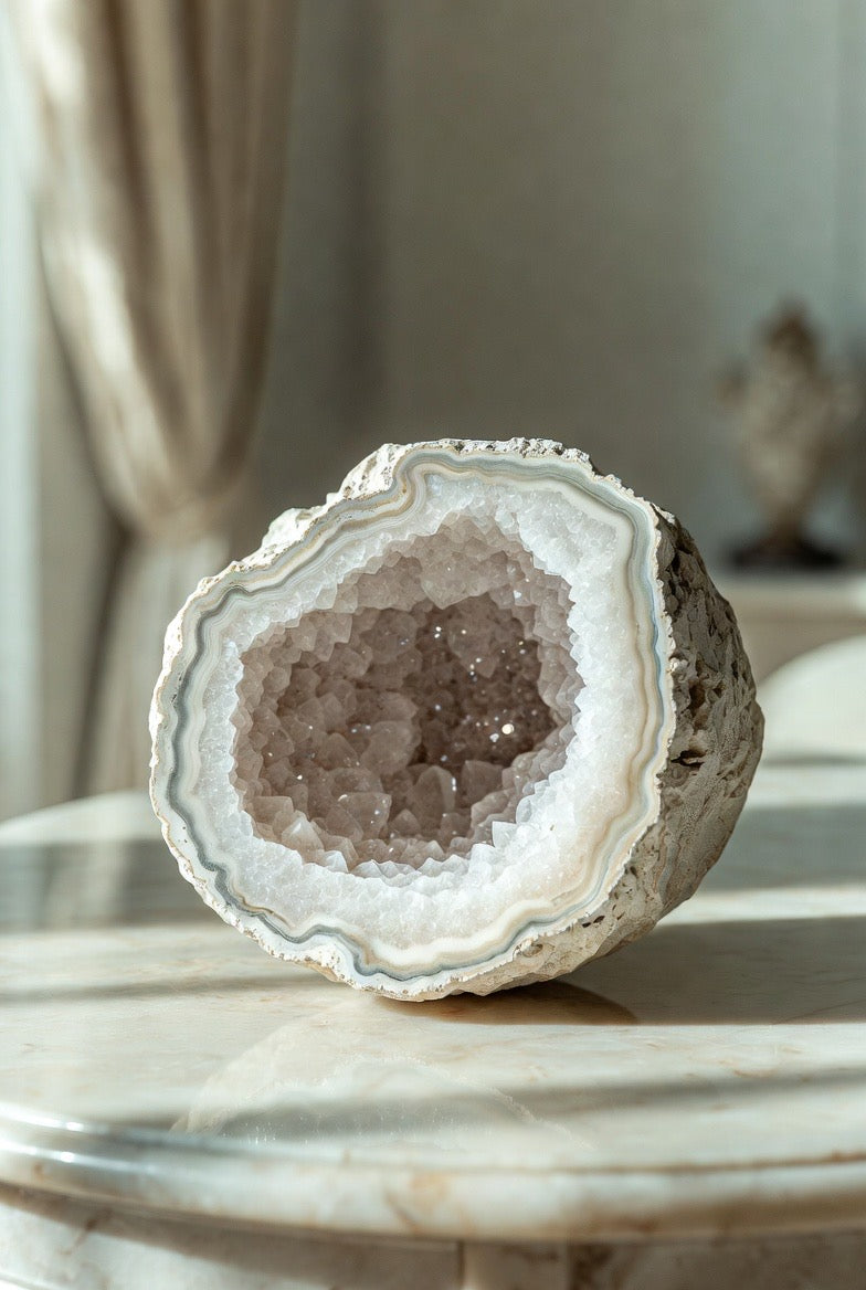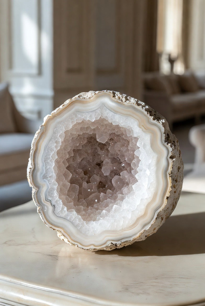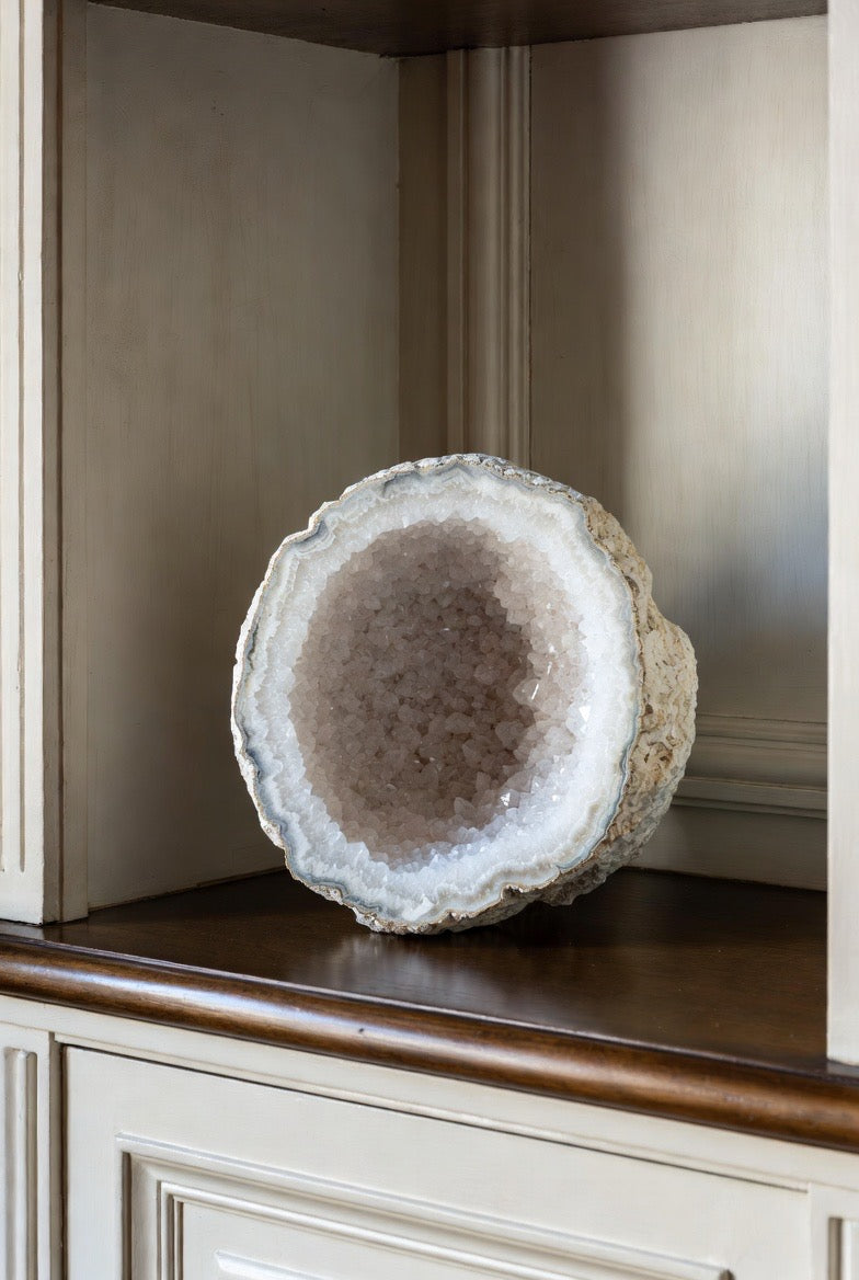 This extraordinary geode brings natural luxury into any space. Its white crystalline druzy center sparkles beautifully, catching the light with a soft, refined glow that feels both calming and opulent. Each piece is a one-of-a-kind sculpture from nature, making it a striking statement for elevated interiors.
