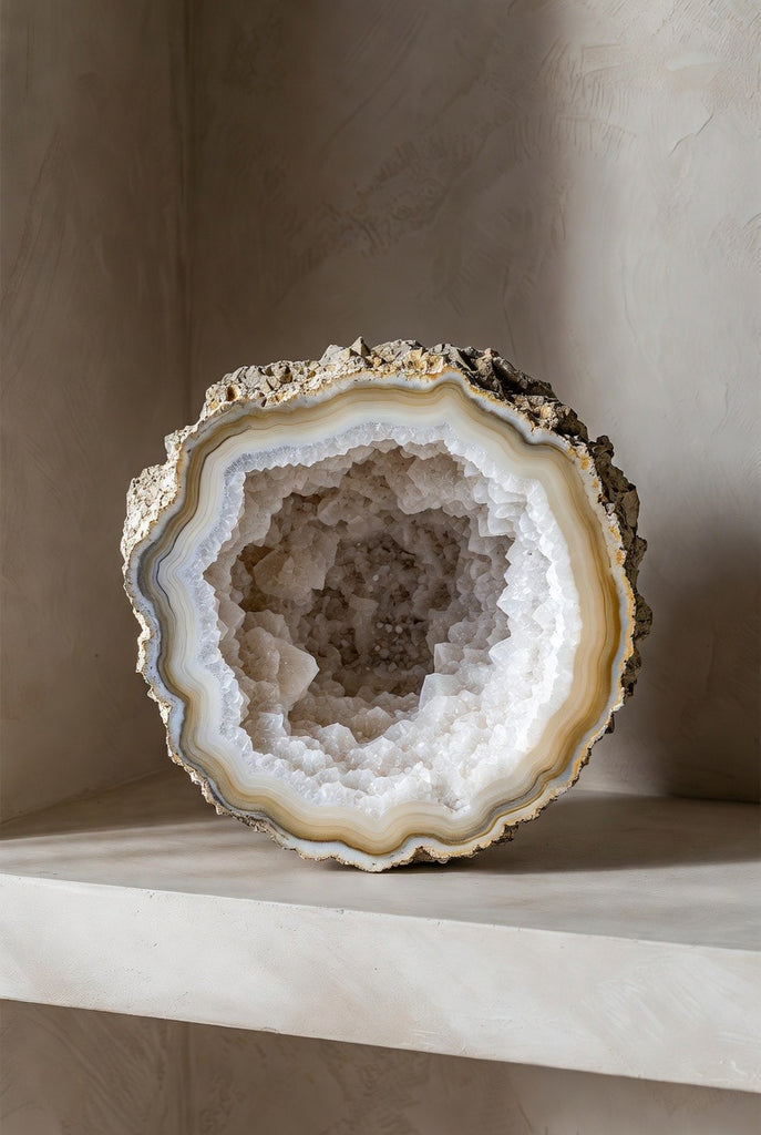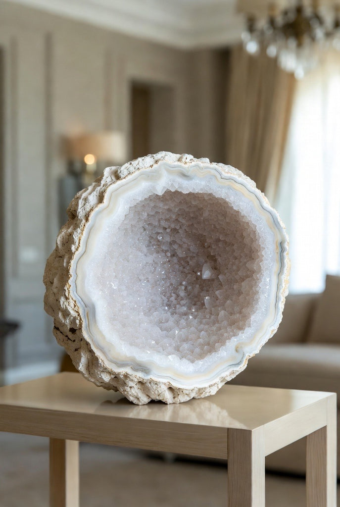 Transform your space with the timeless beauty of our extra large natural geode, featuring a stunning white crystalline druzy center 🤍✨ Perfect for luxury home décor, this show-stopping piece brings harmony, elegance, and natural brilliance to any room.
