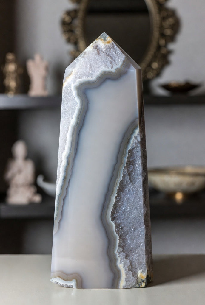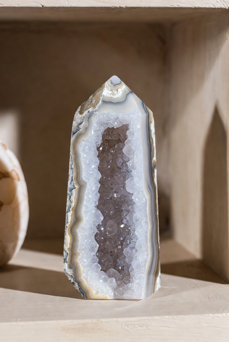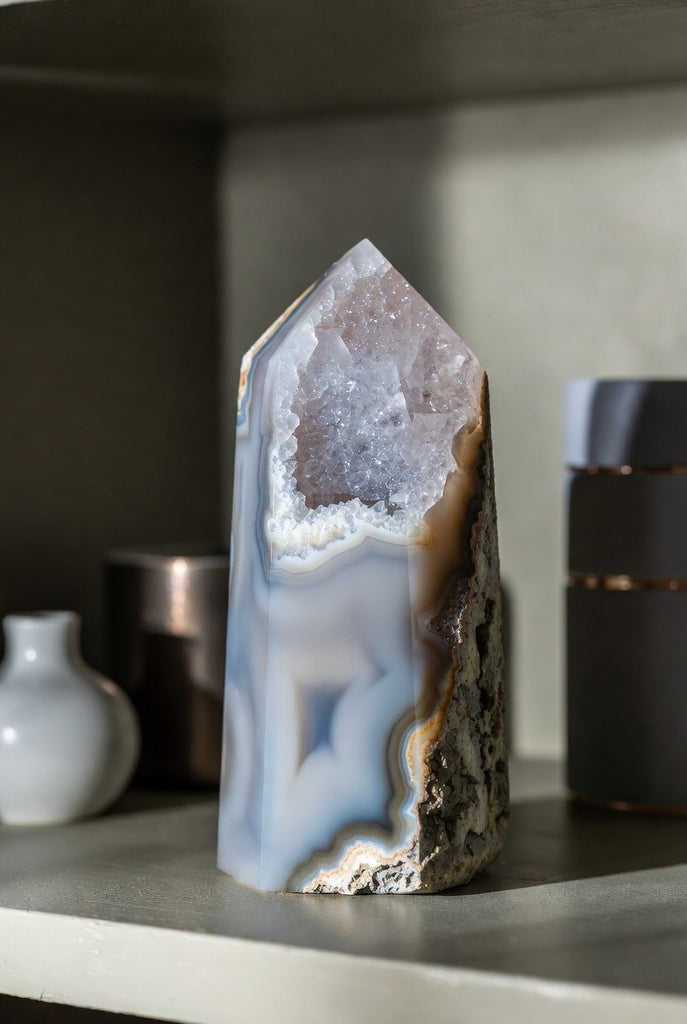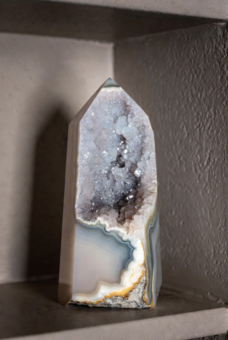 Bring refined beauty into your home with this stunning agate geode point, polished to perfection and bursting with natural crystal texture.
