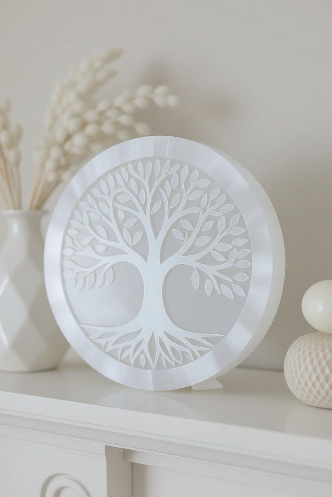 Crafted from pure, shimmering selenite, this plate glows with a soft, moon-like luster. The detailed Tree of Life design adds an inspiring focal pointārepresenting strength, grounding, and unity between the heavens and the earth.