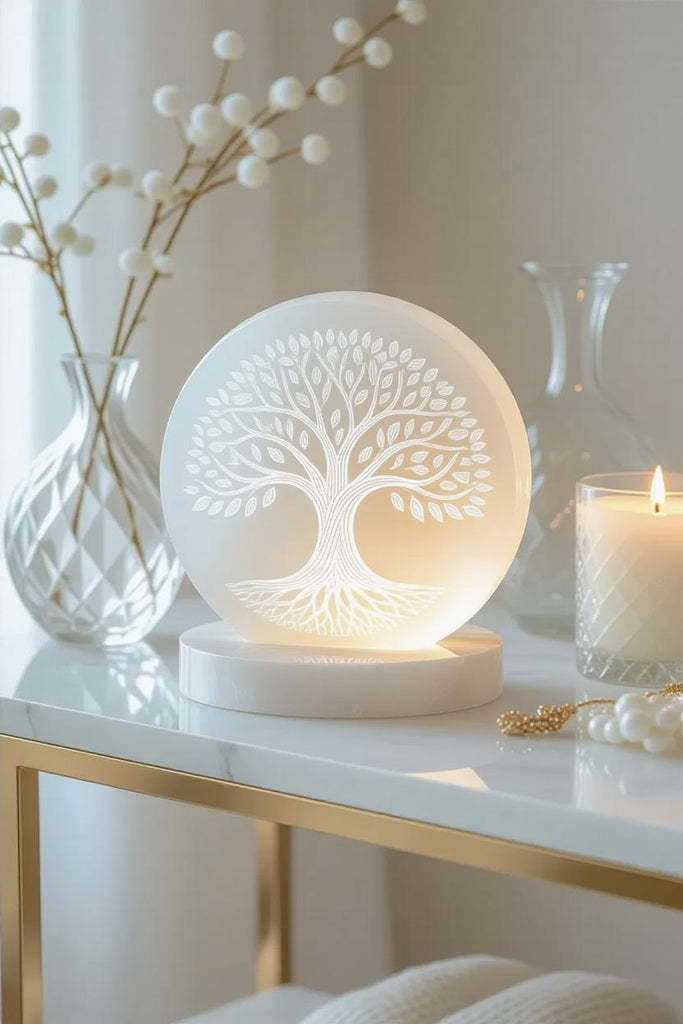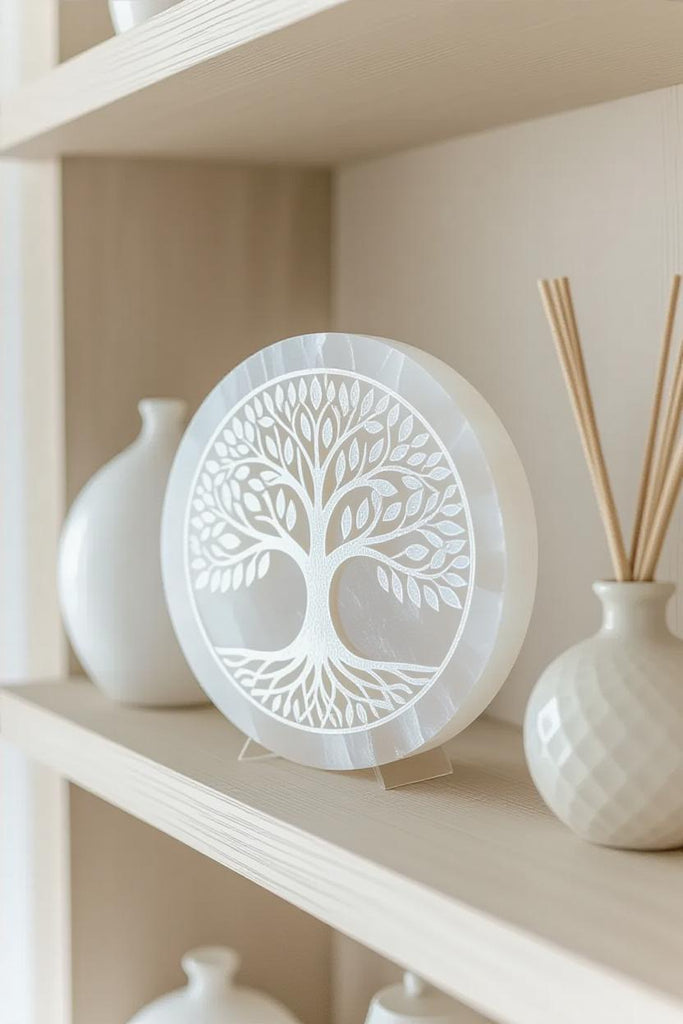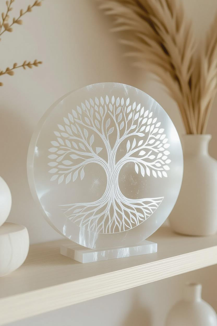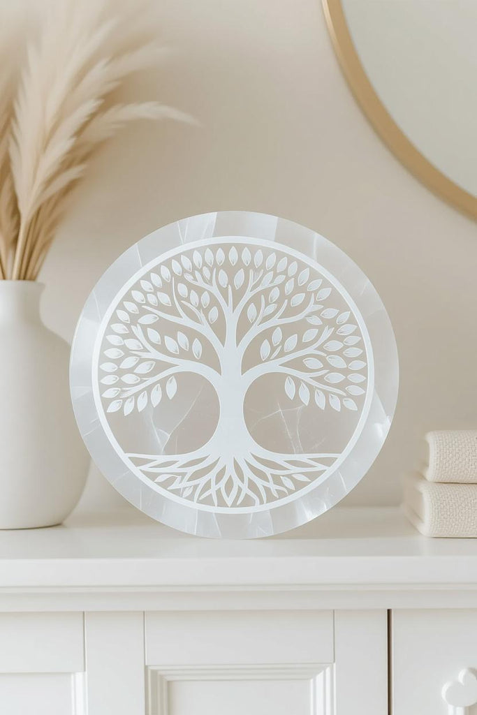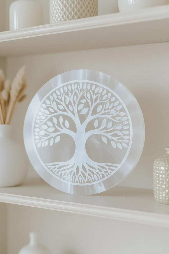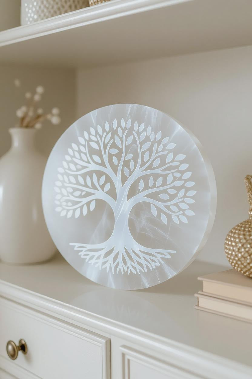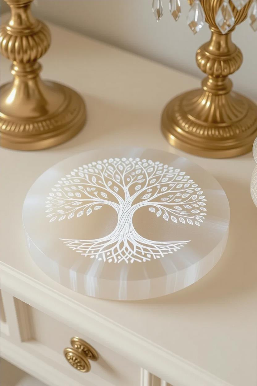 š Illuminate Your Space with a Round Selenite Plate ā Etched with the Tree of Life šæ
