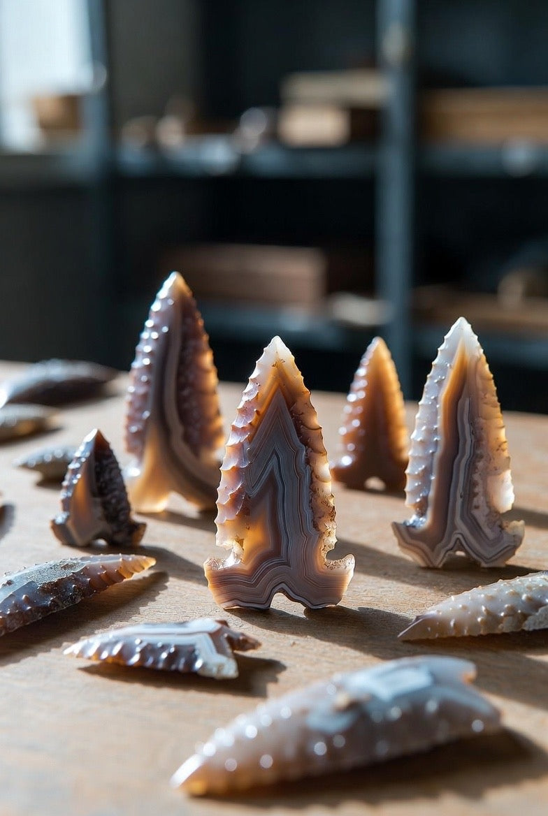 Each arrowhead is individually carved by skilled artisans from genuine gemstones, showcasing unique patterns and natural earth tones like deep moss green, warm amber, smoky quartz, and rich terracotta. No two pieces are alike – each one is a one-of-a-kind treasure.