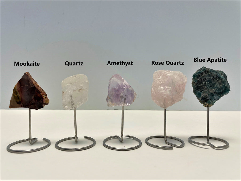 Available in 5 different stones! Amethyst, Blue Apatite, Quartz, Rose Quartz and Mookaite. These mini rough chunks are mounted on metal stands and are approximately 2.5″ tall