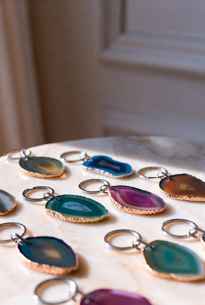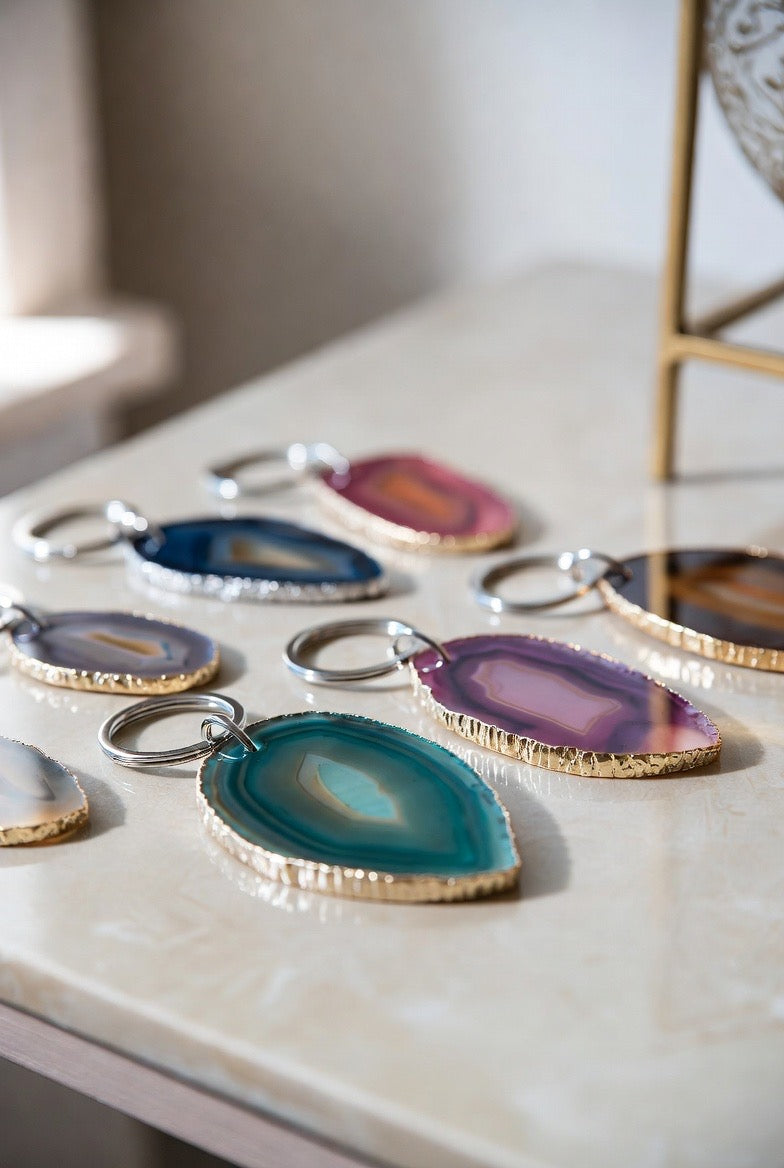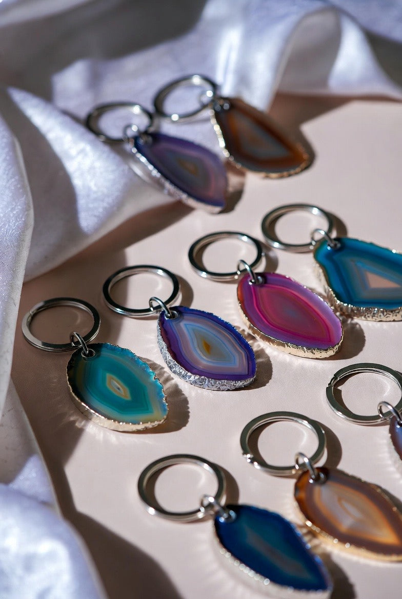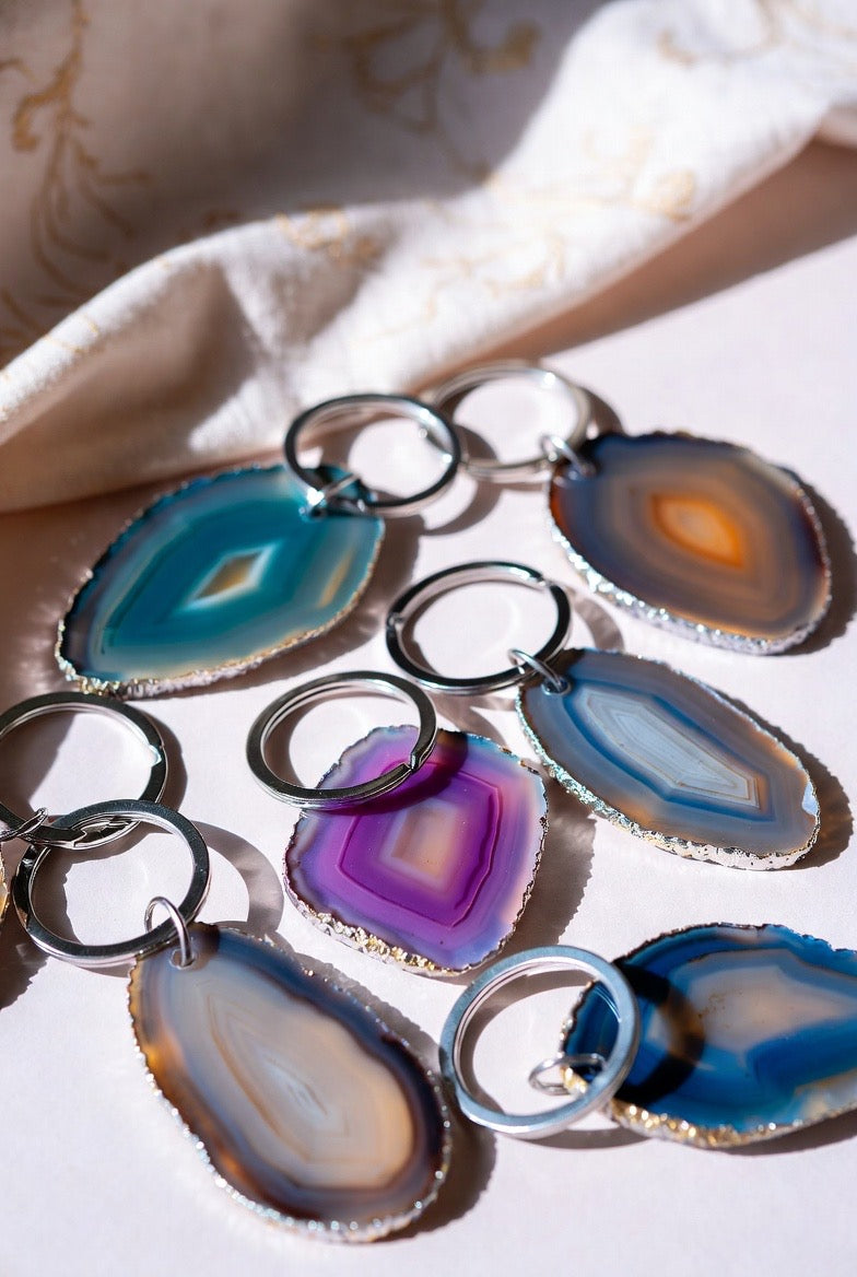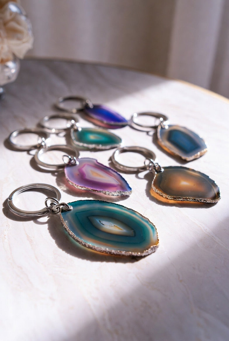 These handmade, thin-slice agate keychains are unique and one-of-a-kind. As enjoyable to look at as they are to use on a daily basis. these gorgeous agate keychains are durable and created for you to use on a daily basis.